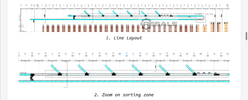 Sorter, Translog, approx. 471m, – used - : Price: ex location: 209.500.-€ (net), packed and loaded! Total length upper line: 327.50m Total length of lower line: 144m Manufacturer: Translog (NL) Year of manufacture: 2023 Drive shaft iConveyor Working width 900 mm Overall width 1,000 mm Length according to scheme 3000 68 204.00 Height level 1: 850 mm +/ 50 mm Level 2: 2,500 mm +/ 50 mm Rollers Fi 50, galvanized steel Roller spacing 75 mm Drive type: Geared motor Side frame: 35 mm Material: Powder-coated steel Drive shaft iConveyor Working width 900 mm Overall width 1,000 mm Length according to scheme 1500 4 6.00 Height level 1: 850 mm +/ 50 mm Level 2: 2 500 mm +/- 50 mm Rollers Fi 50, galvanized steel Roller spacing 75 mm Drive Type: Gear Motor Side frame: 35 mm Construction material: powder-coated steel Ascent/descent conveyor belt Working width ...