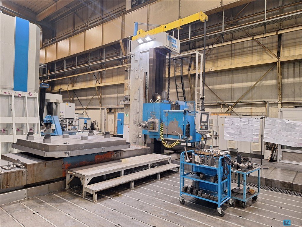 spindle diameter:200 mm x-travel:10000 mm y-travel:4000 mm z-axis:1500 mm W-axis (spindle longitudinal):1000 mm bore spindle turning speed range:1 - 2000 U/min dimension of the ram:600 x 530 mm high speed spindle taper ISO:60/50 rapid motion - x-axis:8000 mm/min rapid motion - y-axis:8000 mm/min rapid traverse Z-axis:5 m/min total power requirement:120 kW weight of the machine ca.:135 t dimensions of the machine ca.:16,0 x 5,0 x 10,0 m with CNC Steuerung HEIDENHAIN iTNC 530 hydrostatic guideways x and Y- axis autom. toolchanger 40-pockets autom. Pickup Station for angular milling head, universal milling head and facing head rotary table 3000 x 3000 mm , max load 60 to. v-axis 2500 mm chip conveyor and coolant attachment