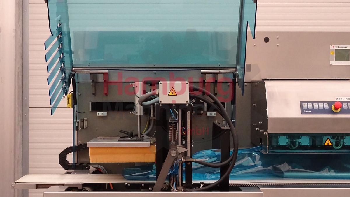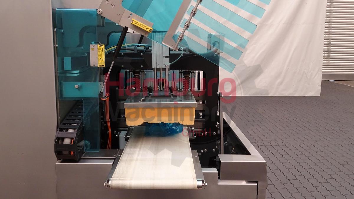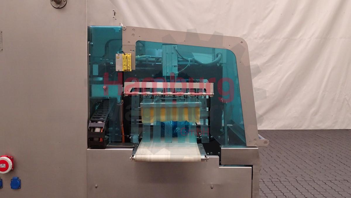 The ULMA Packaging Pacific LSBI 55 is a horizontal flow wrapping machine (HFFS – Horizontal Form Fill Seal) designed for the automatic packaging of a wide range of food products, particularly fresh and perishable items such as meat, poultry, and prepared foods. The machine operates with a bottom film reel (LSBI configuration), where the packaging film is fed from below the product infeed level. This design minimizes contamination risks in the sealing area and ensures high-quality hermetic seals, making it especially suitable for hygienic food applications. The Pacific LSBI 55 forms a three-seal pillow pack by wrapping a continuous film around the product, creating a longitudinal seal along the length of the package and transverse end seals to close each pack. The system is compatible with shrink and barrier films and can be integrated into modified atmosphere packaging (MAP) or shrink-wrapping processes. Packaging formats: Flexible adjustment for different product sizes and shapes. Film specifications: up to approx. 700 mm film width and 350 mm reel diameter. Product size range (typical): Length: from approx. 80 mm, width: up to approx. 360 mm and height: up to approx. 175 mm. Capacity: up to approximately 60 packs per minute, depending on product characteristics and film type. Previously used in a cheeseplant in Austria for packaging portions of semi-hard cheeses., Type of Machine: Horizontal Flow Wrapper, Capacity: up to 60 units / min, Motor: 12 kW - 380 V - 17 A - 50 Hz - 3 Ph, Total dimensions: 460 x 200 x 230 cm, Weight: 2.045 kg