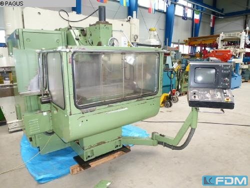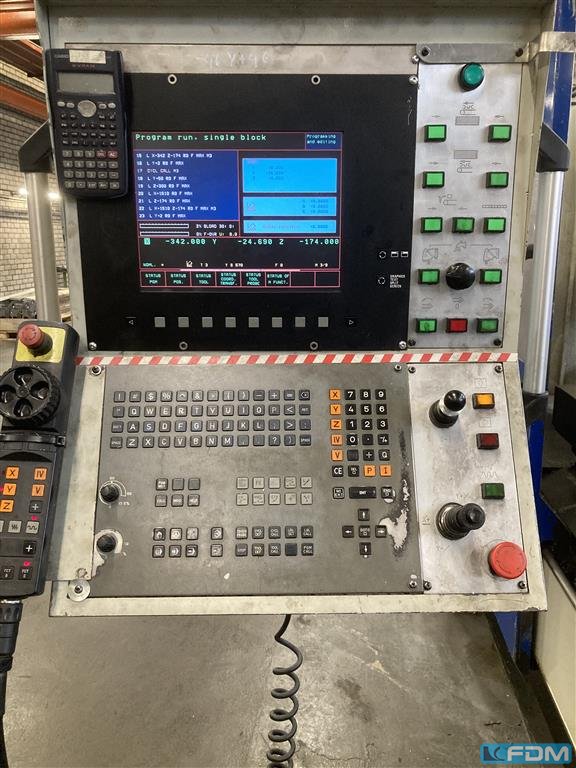 x-travel:500 mm y-travel:400 mm z-travel:330 mm table-size:710 x 410 mm spindle taper ISO:40 quill stroke:100 mm control:HEIDENHAIN TNC 335 B table load:180 kg no. of flutes:8 groove width:14/25 mm tool taper:SK 40 speeds::20 - 3000 U/min feeds:infinitely variable1-1250 mm/min rapid traverse:5000 mm/min total power requirement:13 kW weight of the machine ca.:2500 kg dimensions of the machine ca.:2000 x 2800 x 2300 mm Year:ca. 1984 Zusatzinformationen ? Schile-Elektroschrank mit CNC-Steuerung Heidenhain TNC 355 ? Starrer Winkeltisch 710 x 400mm ? Spritzschutzverkleidung / Halbkabine ? Kopf nach Skala präzise drehbar über Kurbel ? Kopf komplett wegschwenkbar für horizontal Spindel