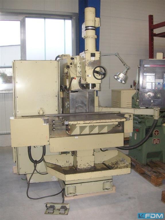 x-travel:600 mm y-travel:400 mm z-travel:400 mm number of spindle speeds:63 - 3.150 1/min feed stepless:12-3000 / 6-1500 (Z) mm/min quill stroke:100 mm milling-head swivable +/-:90° spindle taper ISO:SK 40 surface area:630 x 400 mm total power requirement:8 kW weight of the machine ca.:2,2 t dimensions of the machine ca.:2 x 1,9 x 1,95 m universal milling machine with point to point control, mechanical handwheels, swivel - rotary table (mech.) +-45°, hydr. tool clamping, half cabin, coolant device, manuals (German language)