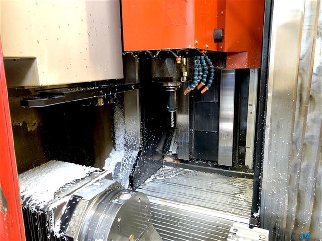 x-travel:850 mm y-travel:500 mm z-travel:610 mm rotary table::400 mm spindle turning speed range:12.000 1/min drive capacity - spindle motor:17/10 kW control:HEIDENHAIN iTNC 530 Tool changer:40- fach spindle taper ISO:SK 40 weight of the machine ca.:7,7 t total power requirement:28,5 kW dimensions of the machine ca.:3 x 2.70 x 3,2 m 5-axis simultaneously universal-machining center, NC-rotary-swivelling table dia. 400mm, 3D infrared touchprobe, el. handwheel, chipconveyor, airblast through spindle, internal coolant supply 40bar, flushgun, direct measuring system, approx. 38.000h "machine on", approx. 14.500h "spindle on"