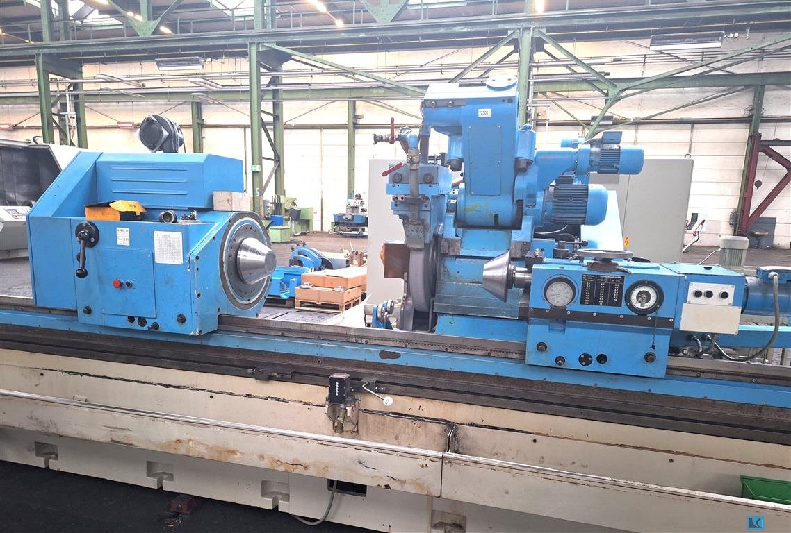 grinding diameter:600 mm grinding length:3000 mm centre height:315 mm workpiece weight max.:3000 kg work piece spindle speed:8 - 120 U/min grinding wheel motor:25 kW grinding wheel speed:45 m/sec grinding wheel width x diameter:750 x 80 mm table speeds:30 - 4500 mm/min feeds of grinding head:0 - 5 mm/min table swivelabel +/-:7,5 ° total power requirement:55 kVA weight of the machine ca.:18 t dimensions of the machine ca.:11,5 x 4 x 2,2 m - Internal grinding device - taper grinding up to 10,1° based on diameter - automatic grinding cycle - grinding wheels and flanges - dressing device - coolant attachment - dust exhauster, various steady rests