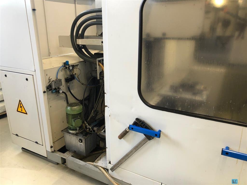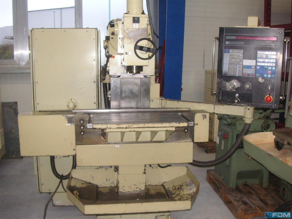 x-travel:500 mm y-travel:400 mm z-travel:330 mm table-size:710 x 410 mm spindle taper ISO:40 quill stroke:100 mm control:HEIDENHAIN TNC 335 B table load:180 kg no. of flutes:8 groove width:14/25 mm tool taper:SK 40 speeds::20 - 3000 U/min feeds:infinitely variable1-1250 mm/min rapid traverse:5000 mm/min total power requirement:13 kW weight of the machine ca.:2500 kg dimensions of the machine ca.:2000 x 2800 x 2300 mm Year:ca. 1984 Zusatzinformationen ? Schile-Elektroschrank mit CNC-Steuerung Heidenhain TNC 355 ? Starrer Winkeltisch 710 x 400mm ? Spritzschutzverkleidung / Halbkabine ? Kopf nach Skala präzise drehbar über Kurbel ? Kopf komplett wegschwenkbar für horizontal Spindel