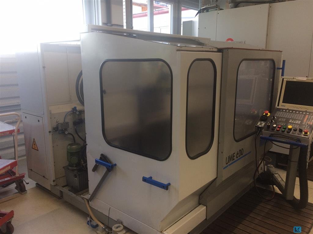 x-travel:600 mm y-travel:500 mm z-travel:450 mm turning speeds:5 - 5000 U/min quill stroke:90 mm total power requirement:9 kW feed range:0-10.000 mm/min weight of the machine ca.:3260 kg dimensions of the machine ca.:2200x2800x2000 mm spindle:6 kW vertical milling head:SK 40 CNC universal milling machine (without toolchanger), Equipped with CNC-Heidenhain TNC 407 el.handwheel coolant device