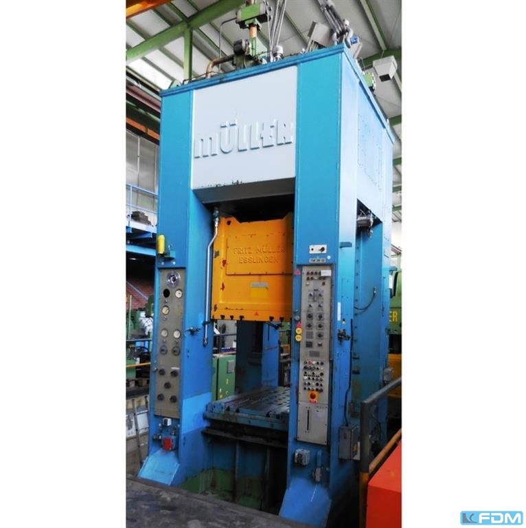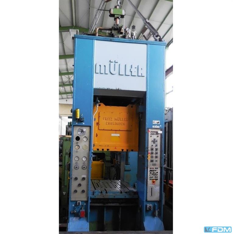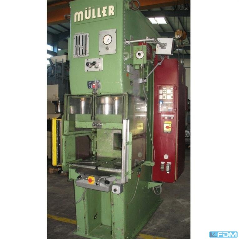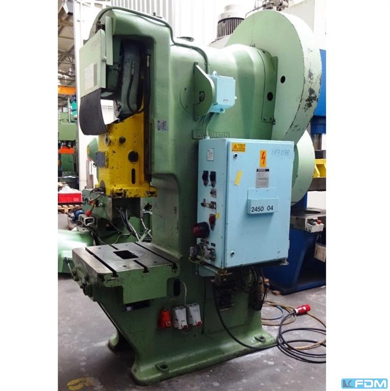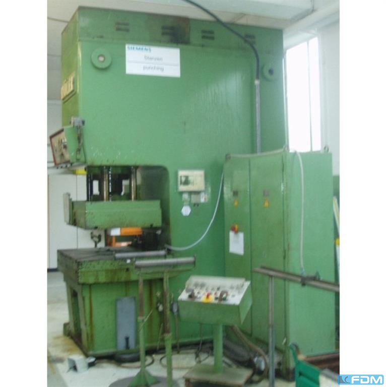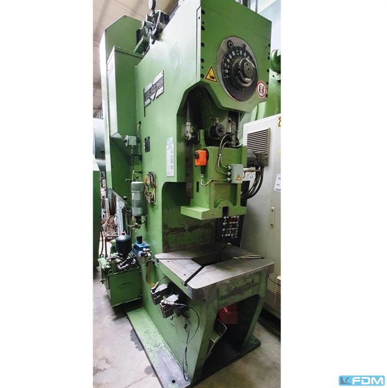 pressure:100 t throat:315 mm stroke:30 - 160 mm no. of strokes:40 /min distance table/ram, max. stroke up, adjustment up:460 mm table surface area:910 x 680 mm Hole in the table:400 mm table height over floor:800 mm passage to the back:400 mm ram surface:630 x 400 mm ram adjustment:80 mm power requirement:7,5 kW weight:7,5 t dimensions (WxDxH):1,7 x 2,0 x 3,0 m German Safety: permitted for manual loading:UVV 11.062 - VBG 7n5.1 clutch:pneumatic overload protection in ram:mechanical ram counterbalance:pneumatic
