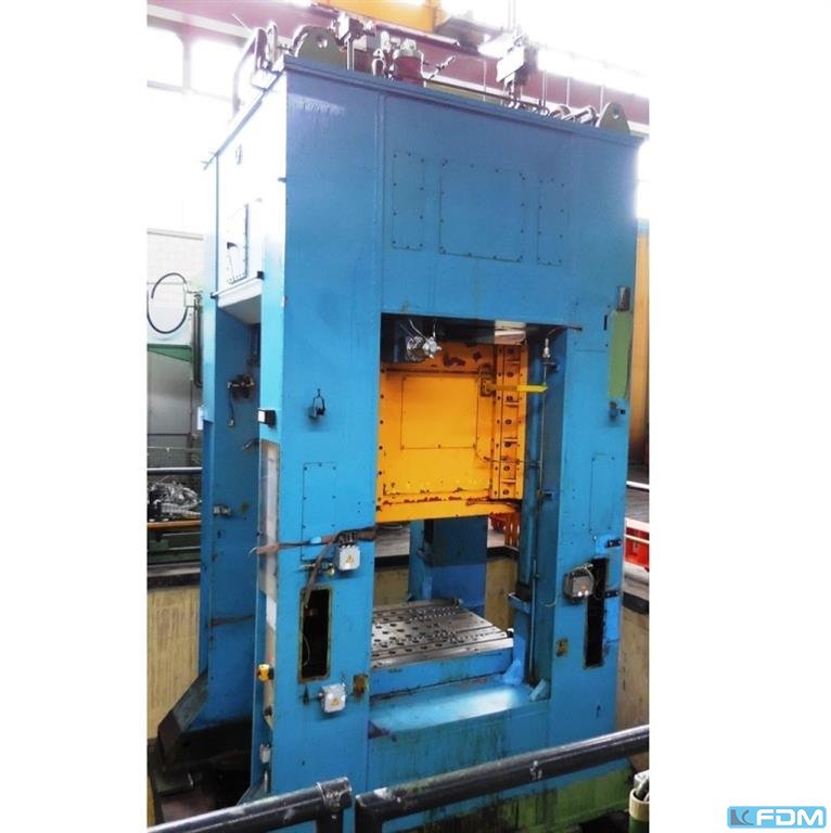 pressure:160 t throat:480 mm stroke fix:fix 180 mm no. of strokes:25 - 70 /min distance table/ram, max. stroke up, adjustment up:650 mm table surface area:1100 x 900 mm Hole in the table:450 mm table height over floor:900 mm passage to the back:700 mm ram surface:900 x 600 mm ram adjustment:144 mm power requirement:30,75 kW weight:15,3 t dimensions (WxDxH):2,0 x 2,4 x 3,75 m German Safety: permitted for manual loading:UVV 11.062 - VBG 7n5.1 clutch-/ brake combination:pneumatic, Desch overload protection in ram:hydraulic ram counterbalance:pneumatic
