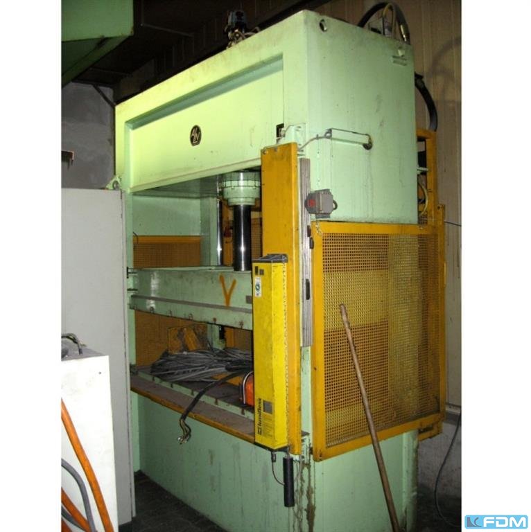 pressure:200 t distance between columns:970 mm stroke:360 mm Distance table/ram, max. stroke up, adjustment up:630 mm table surface area:1000 x 800 mm capacity of ejector:10 t ejector stroke in table:160 mm table height over floor:850 mm side window:400 mm ram surface:1000 x 800 mm speed down:420 mm/s speed up:410 mm/s working speed:50 mm/s oil volume:1240 l return capacity:24 t power requirement:45,0 + 15,0 kW weight:16,0 t dimensions (WxDxH):2,7 x 2,5 x 4,3 m German Safety: permitted for manual loading:UVV 11.064 - VBG 7n5.2 ram interlocking:mechanisch foundation pit:nicht erforderlich