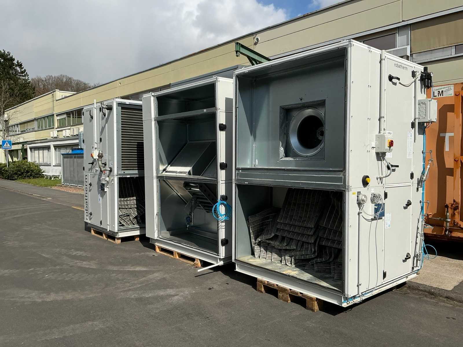 Supply air unit Wolf KGXD 160: air volume: 12,000m³/h, external pressure loss: 300Pa, heating capacity: 102.6kW, cooling capacity: 82.8kW, motor power: 7.5kW, rated current: 14.8/8.5A, speed: 1440rpm. Exhaust air unit Wolf KGXD 160: air volume: 12,000m³/h, external pressure loss: 300Pa, motor power: 5.5kW, rated current: 11.2/6.5A, speed: 1440rpm. System is fully functional, an on-site inspection is possible.