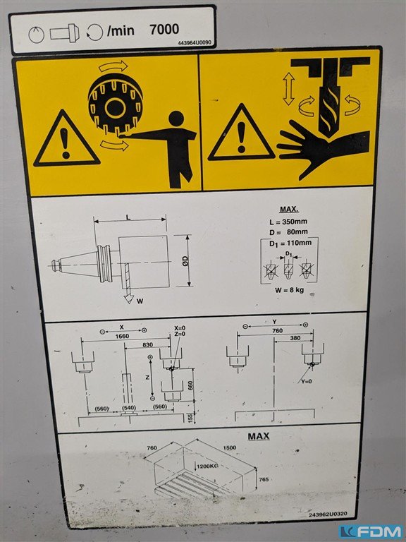 x-travel:1660 mm y-travel:760 mm z-travel:660 mm weight of the machine ca.:8700 t dimensions of the machine ca.:4.320 x 3.380 mm distance spindlenose - table min./max.:808 mm distance work spindle /surface of the table:155 - 815 mm Machine height:2850 mm floor space required (w/o switchgear cabinet):4.320 x 3.380 mm spindle motor:11 (10 Minuten) /7,5 (30 Minuten)/ 5,5 (Dauerbetrieb) kW tool taper:SK 40 Spindle RPM:40 - 7.000 (Standard ) / 40 - 10.000 ( Option ) 1/min surface area:2.000 x 760 mm max. table load:1.000 kg feeds X-axis:1 - 5.000 mm/min rapid traverse X-axis:24.000 m/min rapid traverse Y-axis:24.000 feeds Y-axis:1 - 5.000 mm/min feeds Z-axis:1 - 5.000 mm/min rapid traverse Z-axis:20.000 m/min