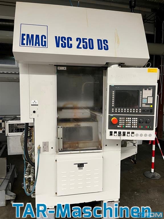 Article: Vertical turning and grinding centre Manufacturer: EMAG Type: VSC 250 DS Yob: 2008 Control: SIEMENS 840D Grinding spindle speed: 30,000 rpm Rotation spindle speed: 3,000 rpm Tool places turret: 12 Cooler for spindle and machine bed cooling Cooling lubricant - lifting station (no independent cooling lubricant supply) Chip conveyor Parts handling Air through the spindle Two clamping circuits through the spindle (air and oil) Unfortunately, the grinding spindle is defective. However, this can be overhauled in a spindle factory. Otherwise the machine is in a very good condition and fully functional. Please, contact us for getting more information and pictures on mail(at)tar-mc.com or www.tar-mc.com