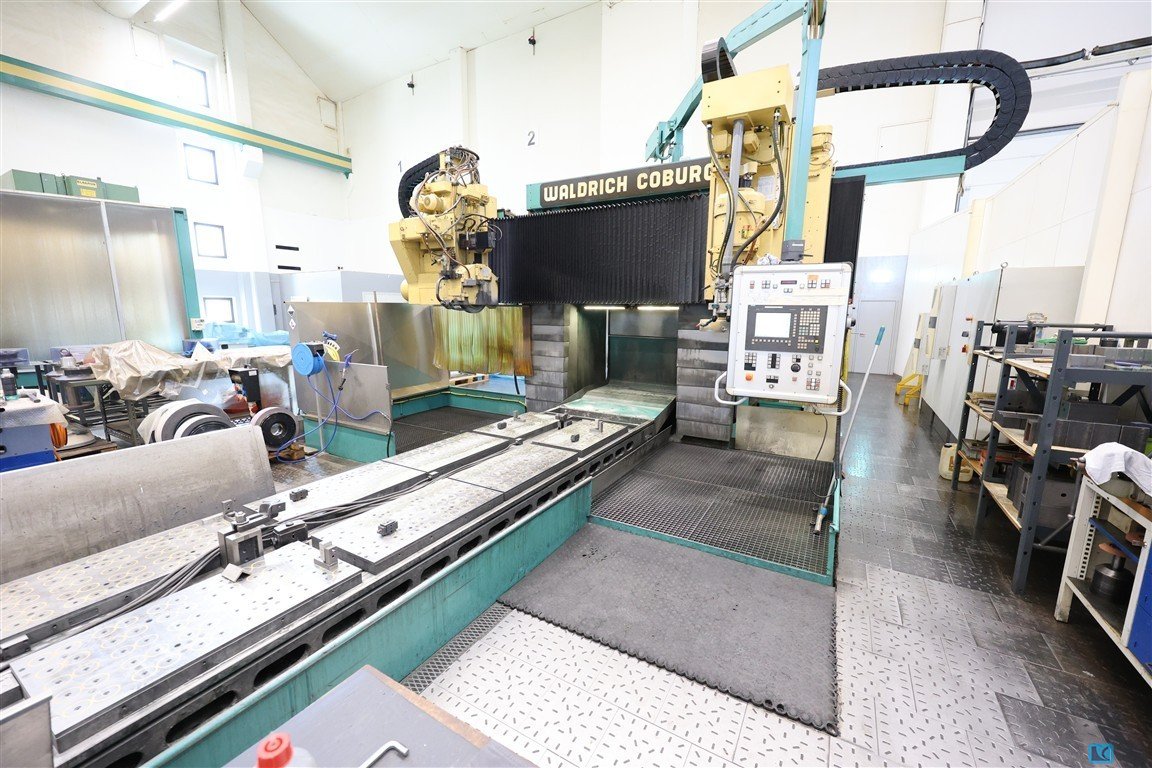 An old plano milling machine (guideway grinding machine) Waldrich Coburg is available. Bed length: 5500mm, bed width: 750mm, machine dimensions X/Y/Z: approx. 12000mm/300mm/3000mm, weight: approx. 37500kg. An on-site inspection is possible.