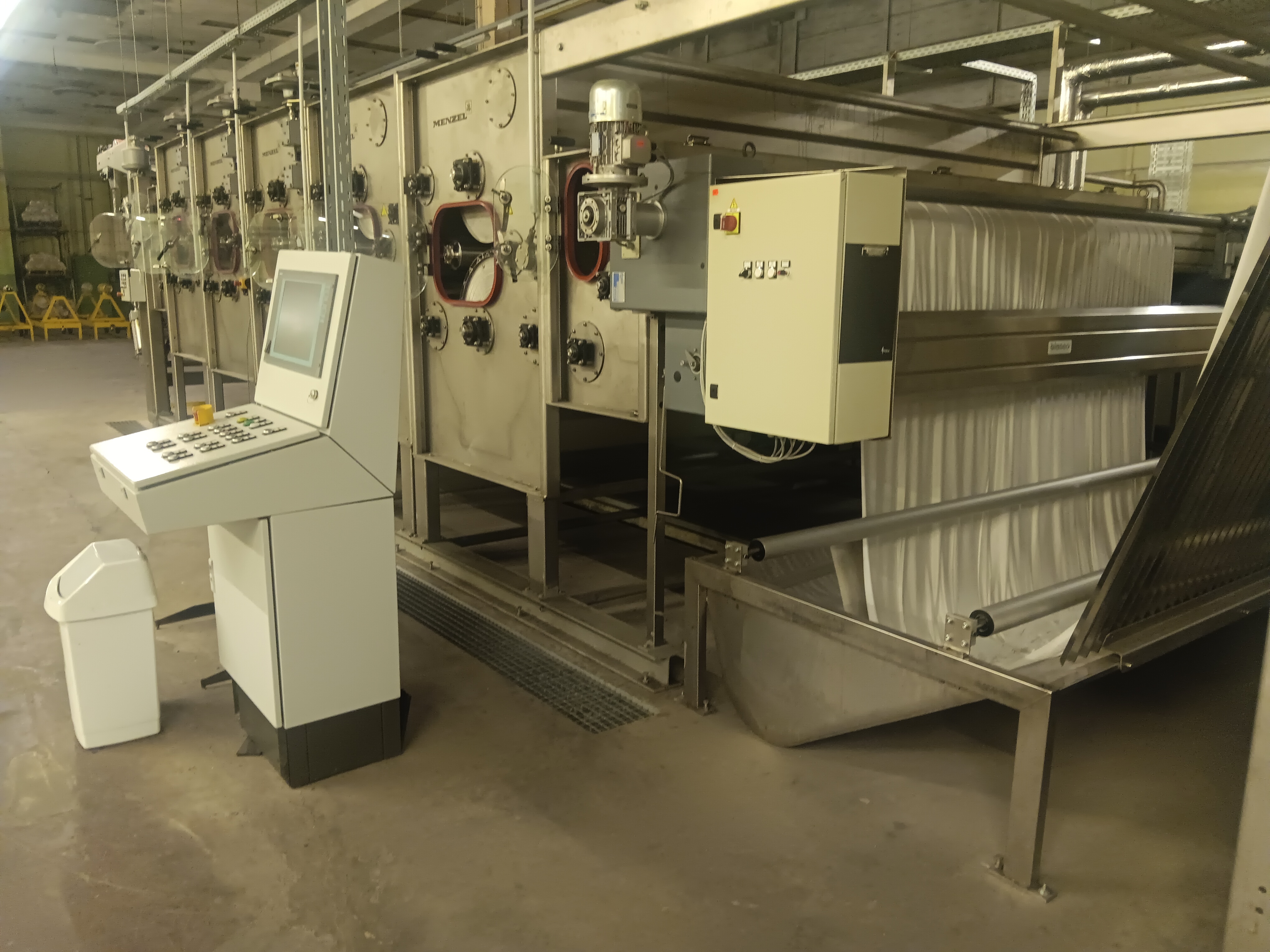 Manufacturer: Menzel Type of Machine: Washing Line Year of Manufacture: 2013 Technical Data Fabric Type: Warp knit, lace, Raschel goods, tricot Material Composition: - 100% Polyamide - 100% Polyester - Polyamide/Spandex (Elastane up to 30%) Dimensions & Weight: - Material Width: 2,200 – 3,200 mm - Roller Width: 3,400 mm - Fabric Weight: 50 – 265 g/m² Performance: - Production Speed: up to 40 m/min - Process: Spun oil removing, water-based washing Chemicals Used: - Oil-emulsifier - Washing/wetting agent - Alkali - Acetic acid for pH neutralization Steel Grades: - Lateral Frames: AISI 304 (V2A) - Parts in Contact with Media: AISI 316 (V4A) Machine Specs: - Unwinder Diameter: 1400 mm - Winder Diameter: 1800 mm Power & Utilities: - Voltage: 230/400 V, 50 Hz, 3 Phase - Steam Pressure: 4 – 6 bar - Compressed Air (Oil-Free): 6 – 7 bar - Water Pressure: 2 – ...