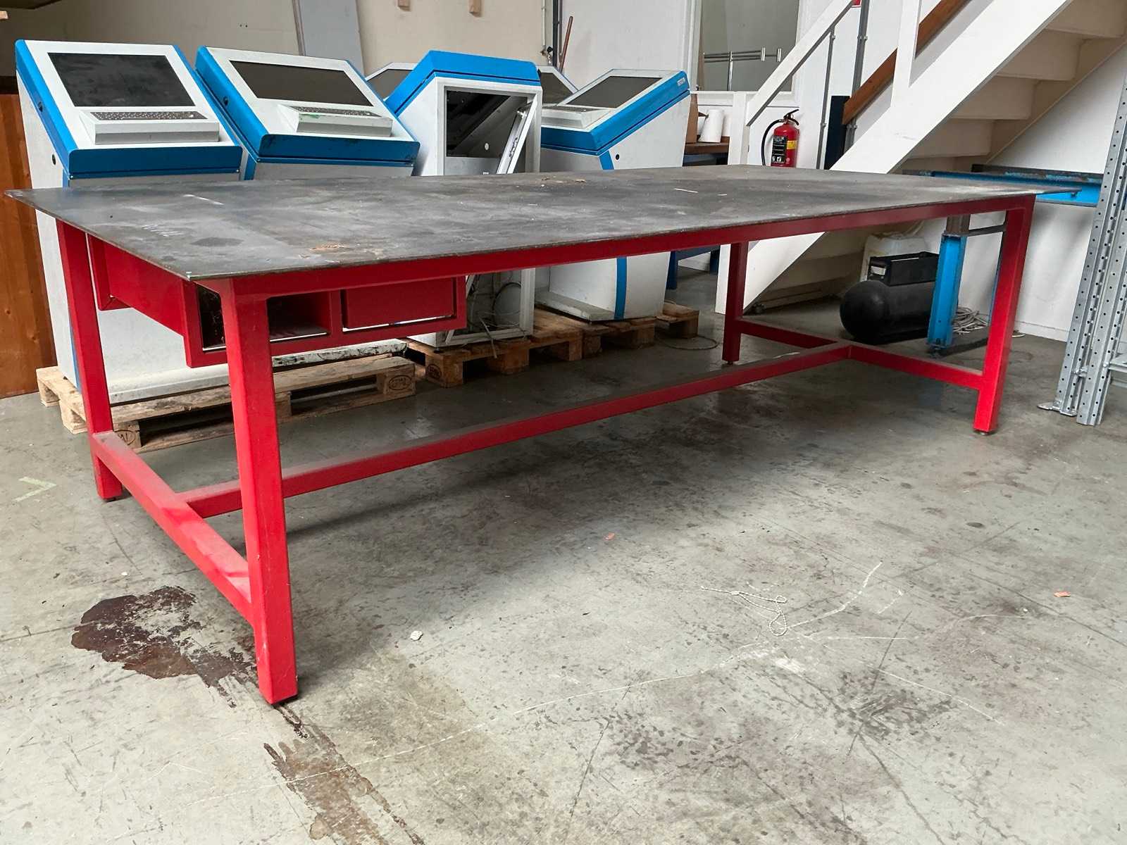 table length: 3000 mm table width: 1500 mm table height: 850 mm Vertikal stroke: 50 mm weight of the machine ca.: 1,5 t dimensions: 3,0 x 1,5 x 0,9 m Welding table SIGMUND Professional 750 + Plasma-nitrided is made of high quality steel S355J2 + N and is plasma nitrided. Surface hardness max. 750 Vickers. The table has a material thickness of approx. 24.5-27mm. The holes have a diameter of 28mm. Hole arrangement in 100 mm grid on the table top parallel hole arrangement in 50 mm grid on the sides. Incl. Foot basic equipment. Pictured accessories optional. Price indication plus packaging and transport. The data for this ad was created with ModulMWS - the software solution of LogoTech oHG.