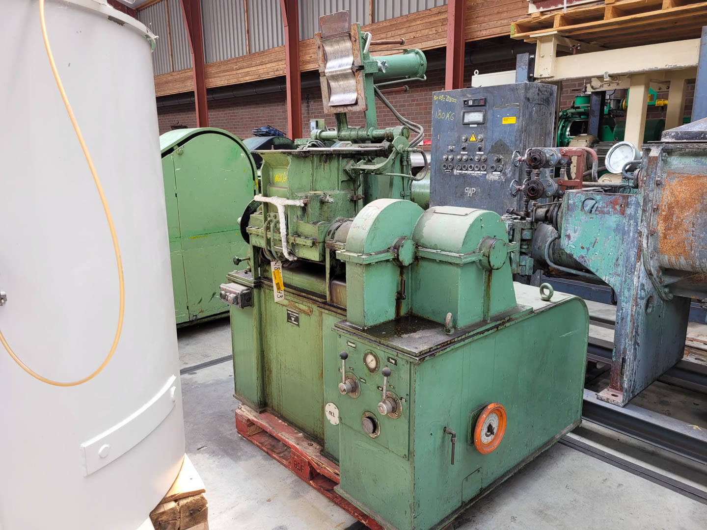 General SKU186K643 MakeWerner und Pfleiderer TypeLDUK 6 - IInS No.111045 Year of construction1962 Mounted on framecheck Pressure Working pressure10 Bar Main Features MaterialMild steel Volume18 Ltr. Motor7.5 KW Specified Features - Z-blade mixer Double screw cont. kneadercheck Jacketcheck With variable speed drivecheck Inlet30 x 195 mm Arm speed21,6-97,2/28,2-127 Rpm Arms can be cooled/heatedcheck Capacity18 l (usefull 8 l) Double shaft kneadercheck dispersion kneader Masticator-armscheck Single gearedcheck With adjustable packing glandscheck With covercheck With hydraulic tiltingcheck Motor7,5 kW (400 V) Z-blade mixers MaterialMild steel Information LocationBarneveld With switchcheck Floorspace1,8 x 1,4 m Total height2 m Weight2500 kg Extra SpecificationsPneumatic tilting. With top ram (pneumatic) Fine chemicalsOther chemicalRubberPlastic & polymersZ-blade mixersCatalysts & fillersDiscountDetergent & surf.Lubricants & oleoDyes & pigmentsMinerals & inorganicPaints & coatingsWerner & PfleidererIndustries > Chemical > Fine chemicalsIndustries > Chemical > Other chemicalIndustries > Chemical > RubberIndustries > Chemical > Plastic & polymersKneaders > Z-blade mixersIndustries > Chemical > Catalysts & fillersDiscountIndustries > Chemical > Detergent & surf.Industries > Chemical > Lubricants & oleoIndustries > Chemical > Dyes & pigmentsIndustries > Chemical > Minerals & inorganicIndustries > Chemical > Paints & coatingsBrand > Werner & Pfleiderer What you can expect from Foeth: -- Machine is in working condition -- At a reduced price compared to new -- Ready for shipping to any destination worldwide -- You are welcome to inspect the machine in Barneveld, The Netherlands. Please visit us in Barneveld for many more machines!