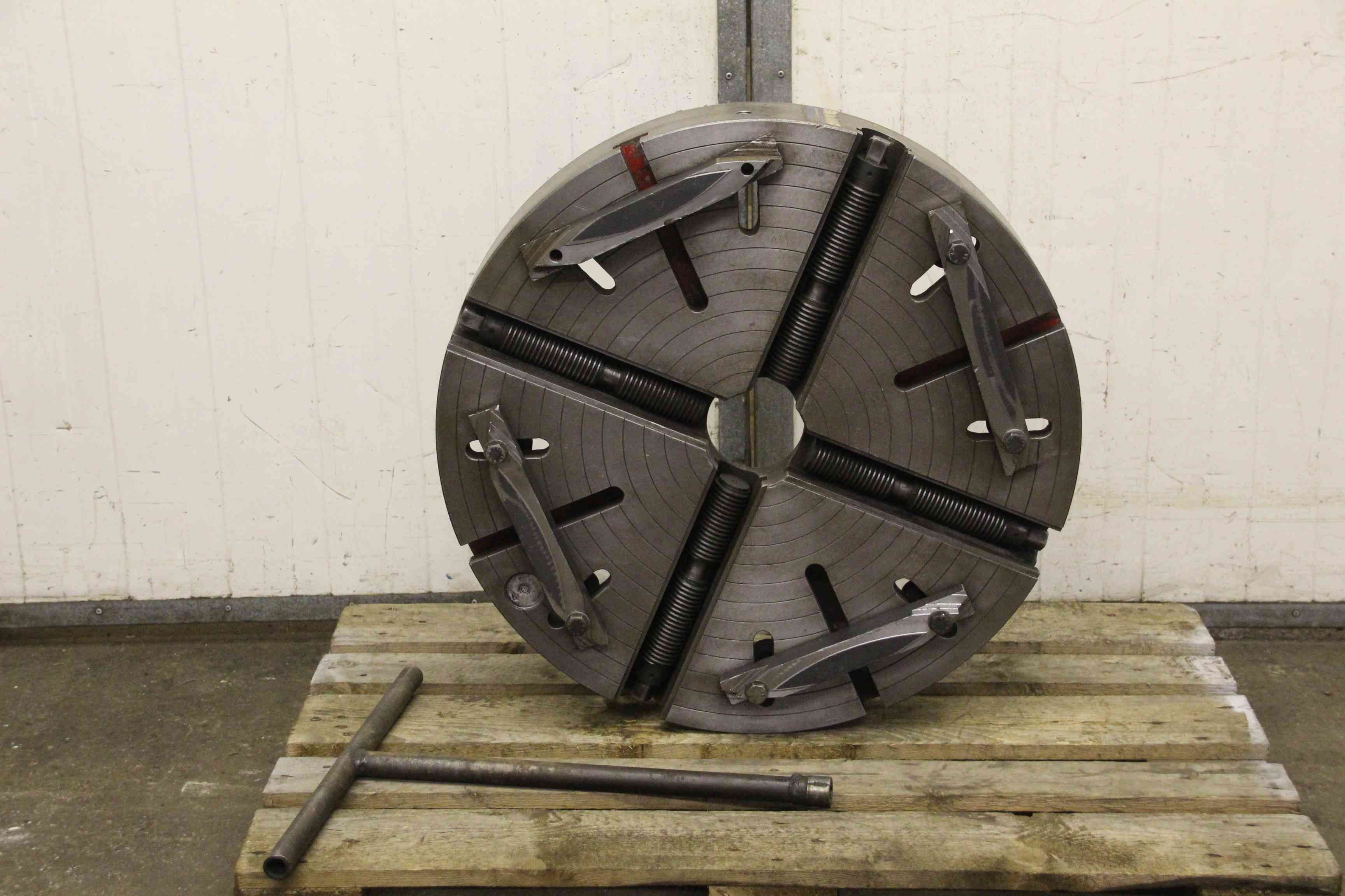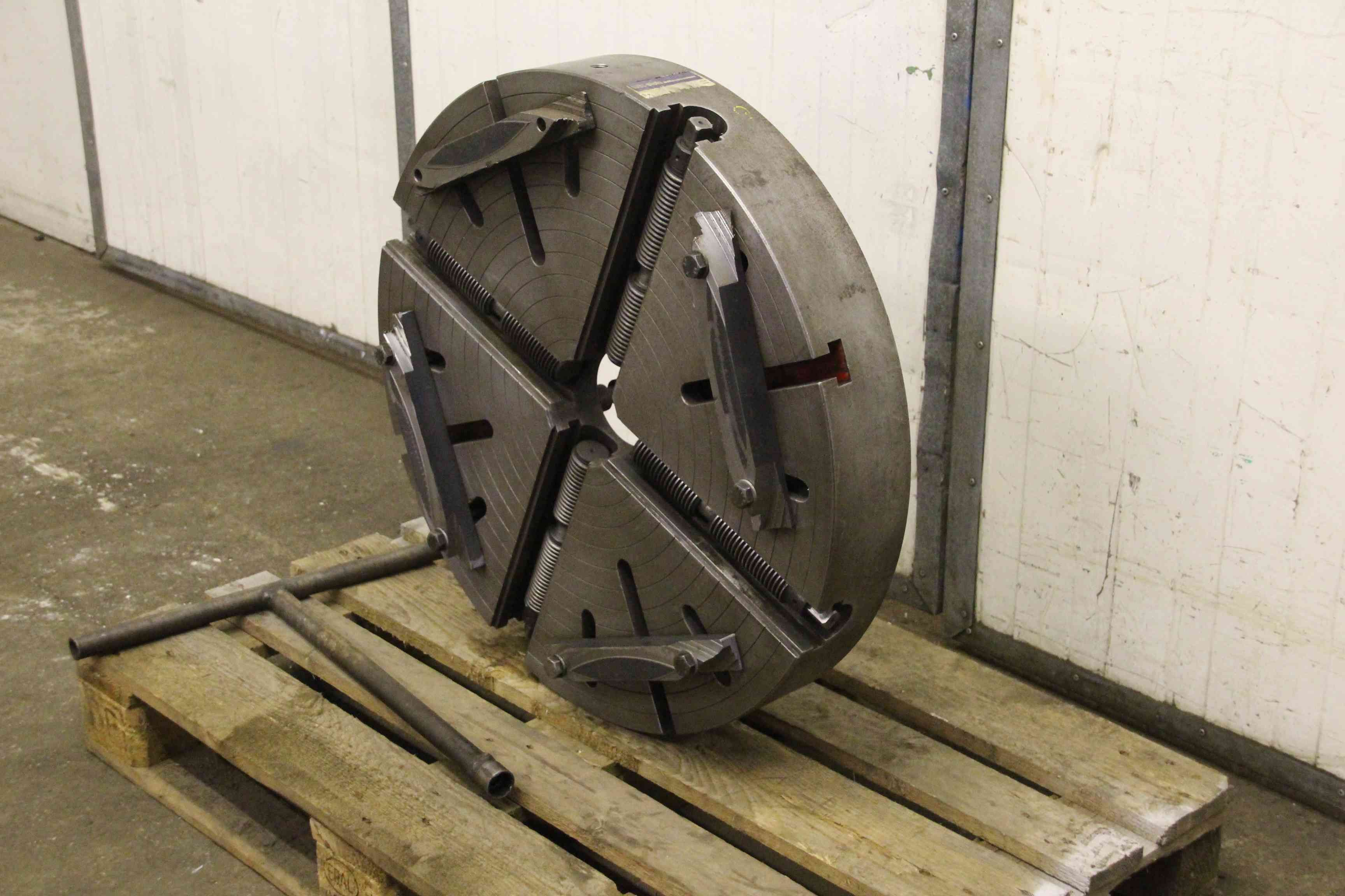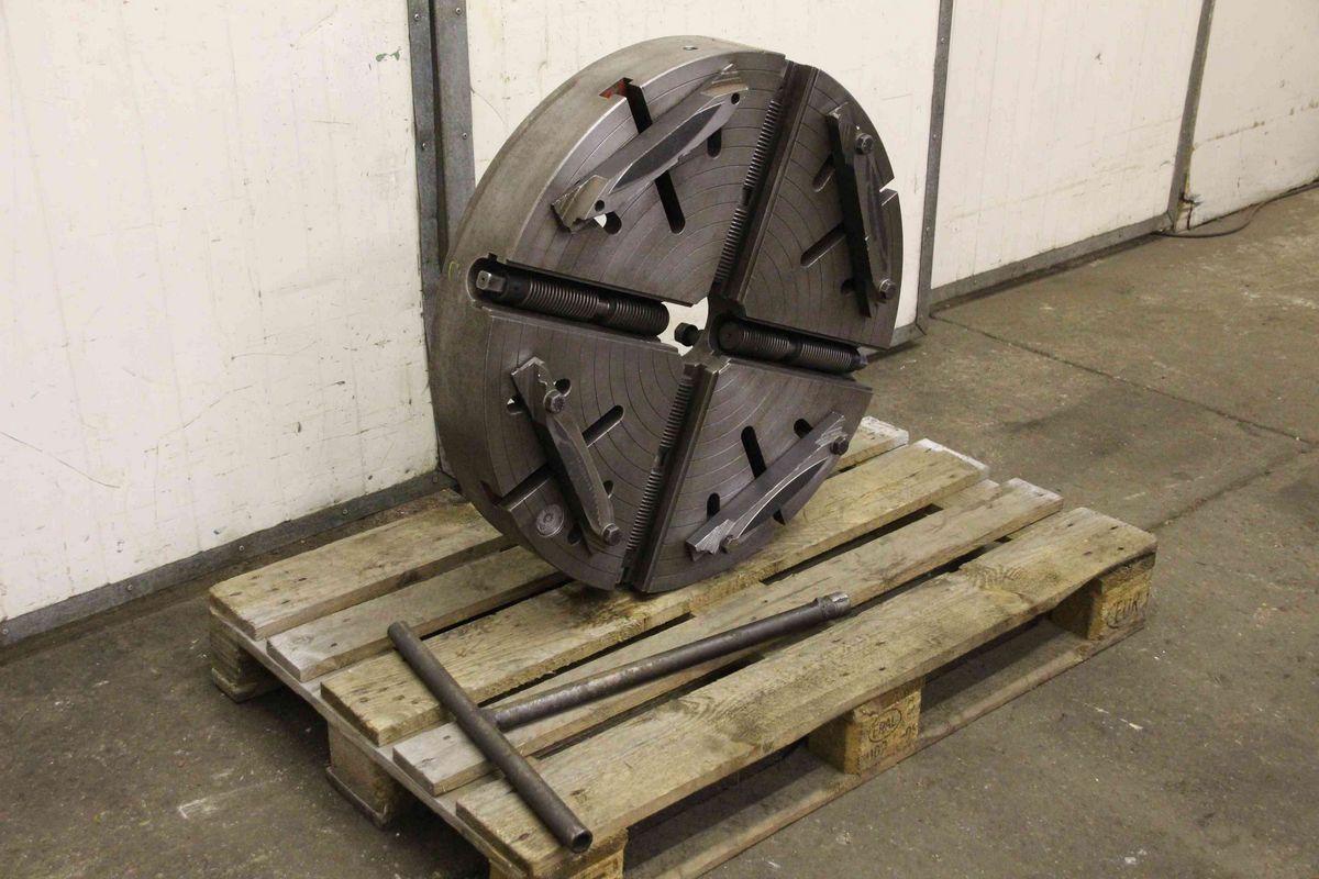 Face plate, face plate chuck, four-jaw chuck, facing chuck -Transfer: in the current condition as seen -Face plate: without jaws -Chuck size: Ø 770 mm -Shot: short taper 11 -Hole circle: Ø 235 mm -Through hole: Ø 120 mm -Groove width: 24 mm -Weight: 234 kg