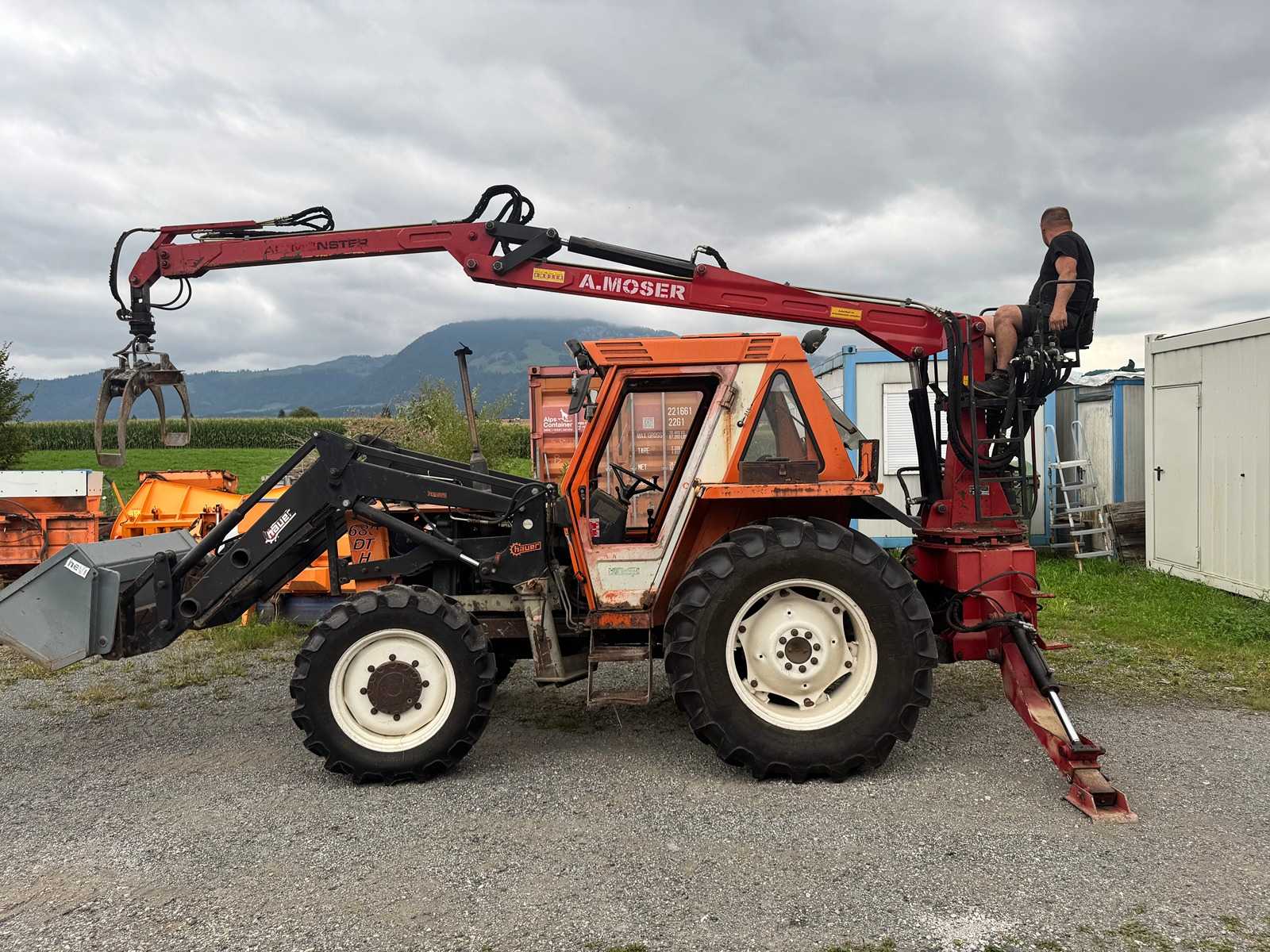 Stable and immediately ready for use loading crane with forestry tongs and rotator suitable for tractor rear attachment and PTO drive. All hydraulic functions can be operated from the operator's cab. Support legs mechanically extendable. Item WITHOUT tractor! Auction-ID: A1-45733-13