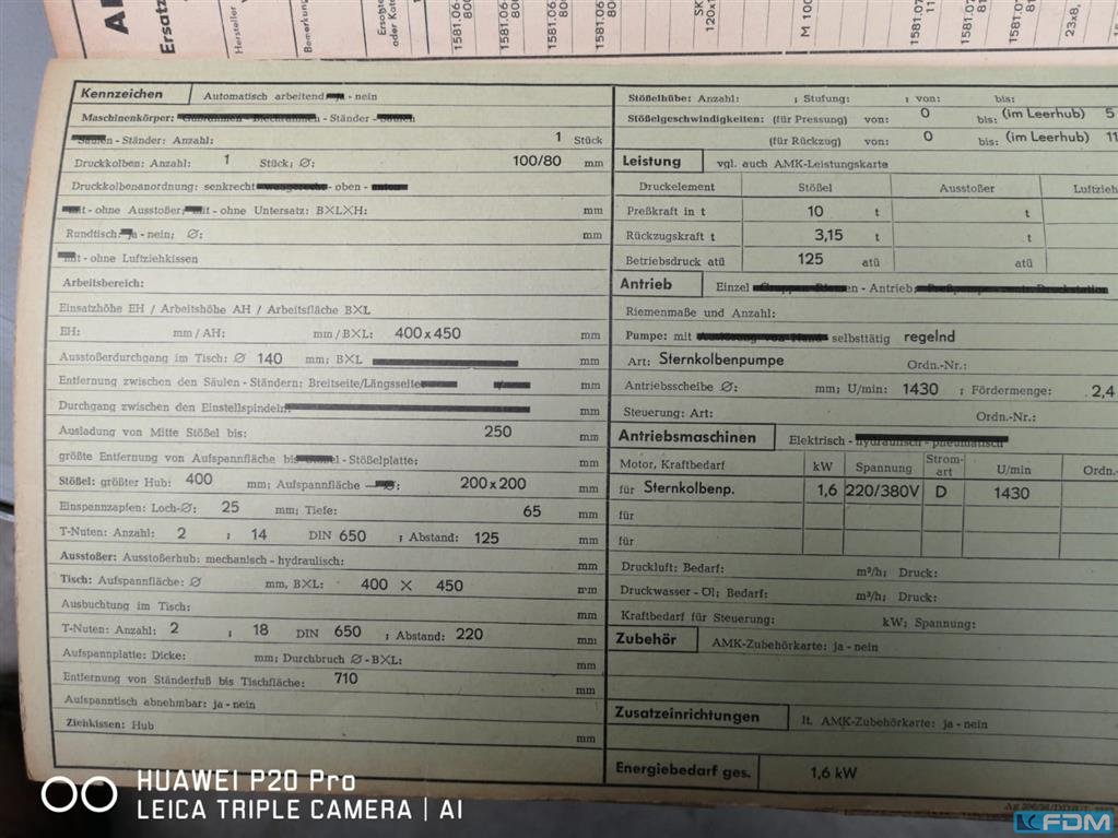 pressure:10 t stroke:400 mm total power requirement:1,6 kW weight of the machine ca.:1,1 t dimensions of the machine ca.:1100 x650 x 2050 mm dayligth:500 mm table-size:400 x 450 mm Documents:vorhanden