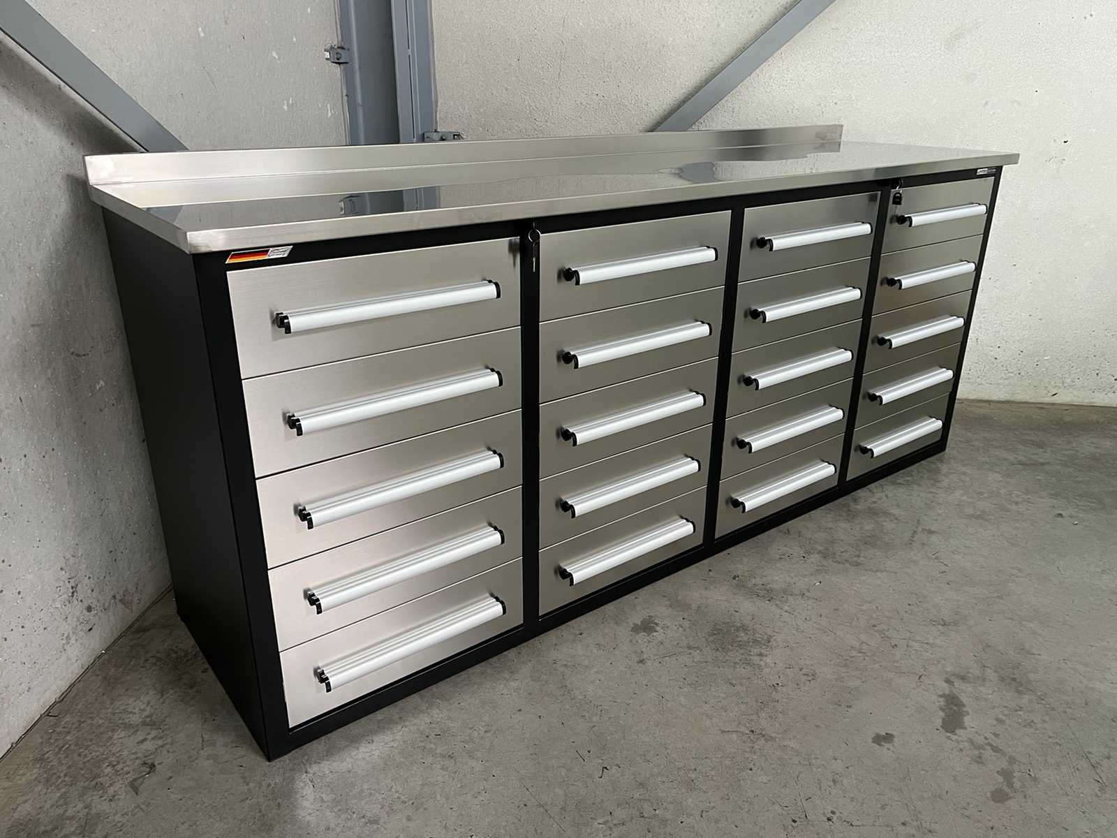 Stainless steel workbench Dimensions: 2210 x 600 x 910 mm Loading: 20 drawers Drawer dimensions: 450 x 480 x 120 mm capacity per drawer: 40 kg Handles: Aluminum handles Worktop: 30 mm thick worktop Worktop capacity: 750 kg Colour: stainless steel Frame: Black powder-coated frame Fronts: Stainless steel fronts Weight: 185 kg Condition: Unused Auction-ID: A3-43511-476