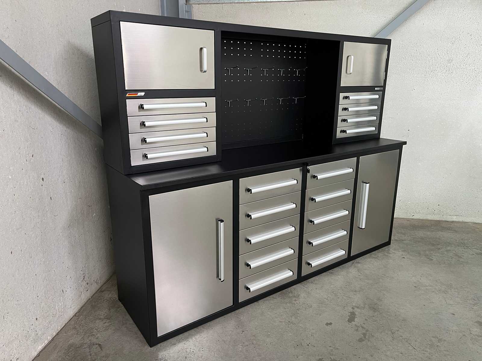 metal workbench Dimensions: 2210 x 600 x 910 mm Loading: 10 drawers Drawer dimensions: 450 x 480 x 120 mm capacity per drawer: 40 kg Doors: 2 doors Dimensions of doors: 500 x 810 mm Handles: Aluminum handles Worktop: 30 mm thick worktop Worktop capacity: 750 kg Color: Black Frame: Powder-coated frame Fronts: lacquered fronts Weight: 182 kg Condition: Unused Auction-ID: A3-43511-471