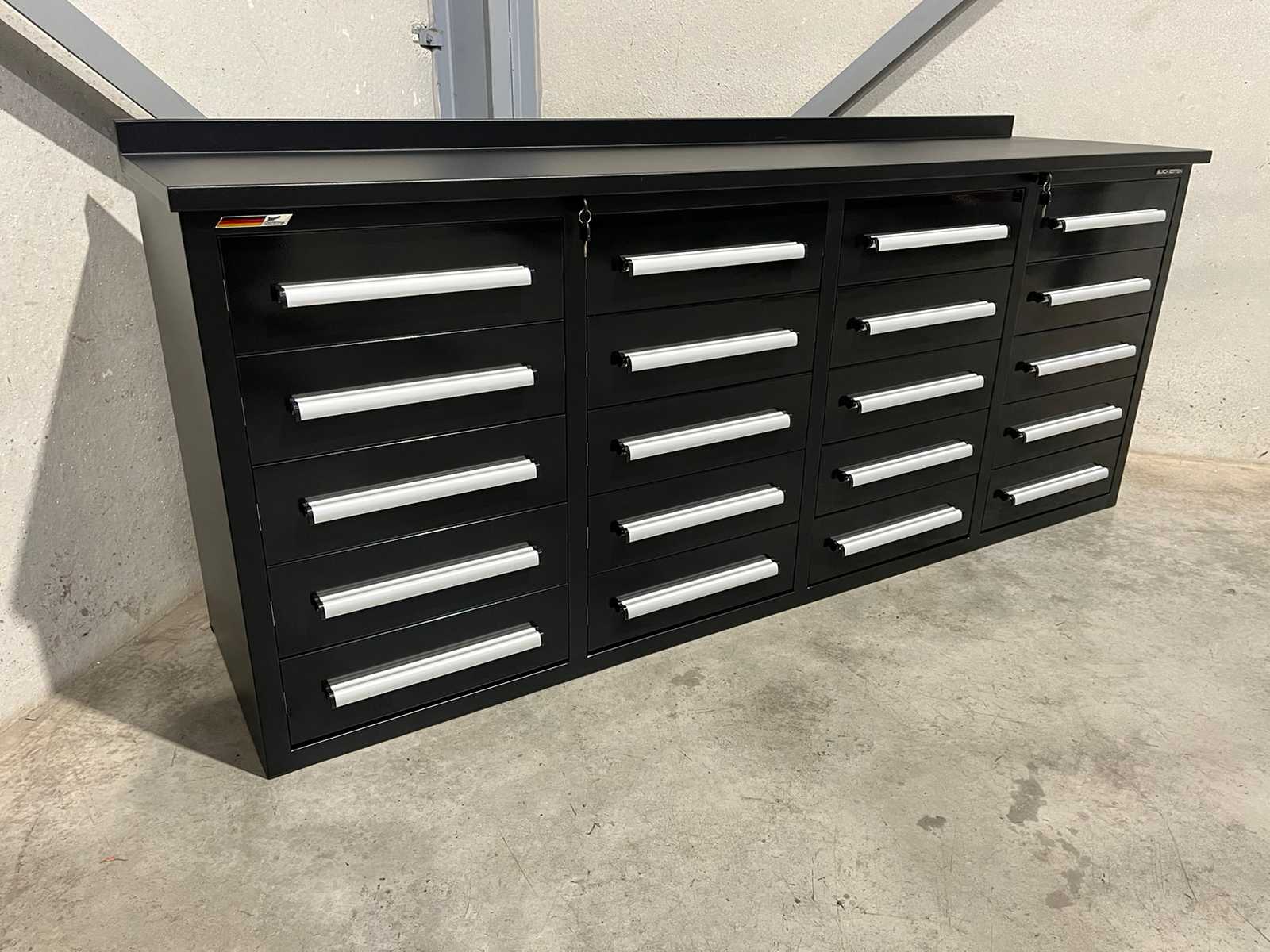 metal workbench Dimensions: 2210 x 600 x 910 mm Loading: 20 drawers Drawer dimensions: 450 x 480 x 120 mm capacity per drawer: 40 kg Handles: Aluminum handles Worktop: 30 mm thick worktop Worktop capacity: 750 kg Color: Black Frame: Powder-coated frame Fronts: lacquered fronts Weight: 185 kg Condition: Unused Auction-ID: A3-43511-472