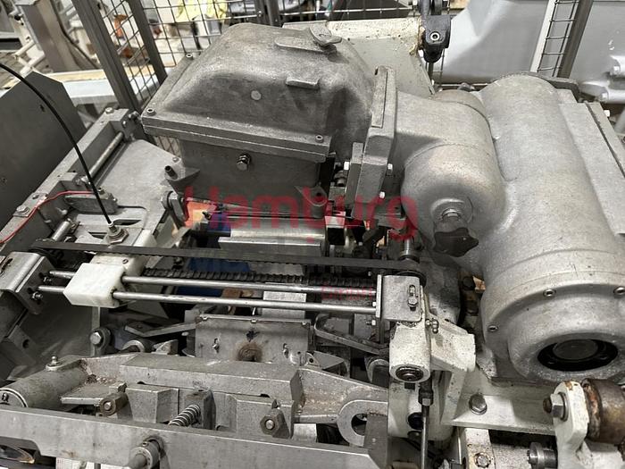 Automatic foil wrapping machine which can be used for packing products like margarine or butter into aluminium foil. The machine is in a good as condition with main control panel with Siemens S7-200 PLC and frequency converter and operation panel with Siemens TD200 Operator Interface. Previously used in a margarine factory. The machine is equiped with a rotating forming drum with 4x rectangular molding chambers. The format on the machine is 250 gram, 98 x 65 x ± 41 mm. SIG folding principle (folding flap on the side, for less foil usage). The margarine is feed with a direct connection with compensator and return line. The machine is equiped with a photocell on the paper infeed, to control the exact position of the print on the foil. The speed can be adjusted by a frequency converter between 30 - 120 packages per minute (depending on product, packaging material and surrounding conditions ...