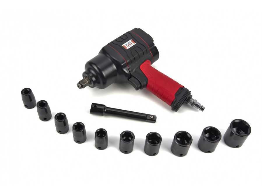 Pneumatic Impact Wrench Set 1/2\" 10 sockets in 9, 10, 11, 13, 14, 17, 19, 22, 24 and 27 mm 1 pc 1/2\" extension rod 1 x 4 mm Allen Wrench In storage case Air consumption at 6 bar 130 l/min Operating pressure 6.3 bar Torque 550 / 685 Nm Weight 2.5 kg Dimensions L-W-H 430 x 350 x 100 mm Condition: never used / new (5) Auction-ID: A1-45681-912