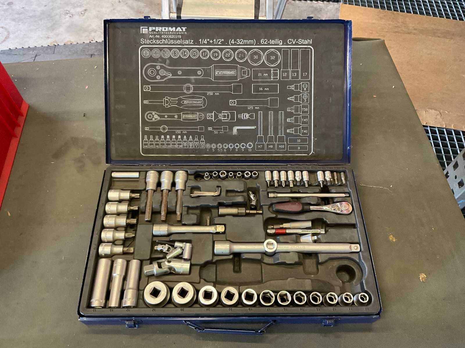 1x 1/4\" torque wrench with 72-tooth drive (range: 5-25 N/M) 1x 3/8\" torque wrench with 72-tooth drive (range: 10-60 N/M) 1x 1/2\" torque wrench with 72-tooth drive (range: 40-220 N/M) 3x Impact sockets (1/2\"): 17mm, 19mm, 21mm 3x Sockets (1/2\"): 17mm, 19mm, 21mm 3x Extensions: 1/4\" x 3\", 3/8\" x 3\", 1/2\" x 5\" 2x Universal couplings (1/4\" & 1/2\") 16x Bit sockets (1/4\"): PH1, PH2, PH3, T10, T15, T20, T25, T30, H2, H2.5, H3, H4, H5, H6, H8, H10 2x Spark Plug Wrenches (14mm, 16mm) with thin wall, 3/8\" drive for BMW unused Auction-ID: A1-40237-77