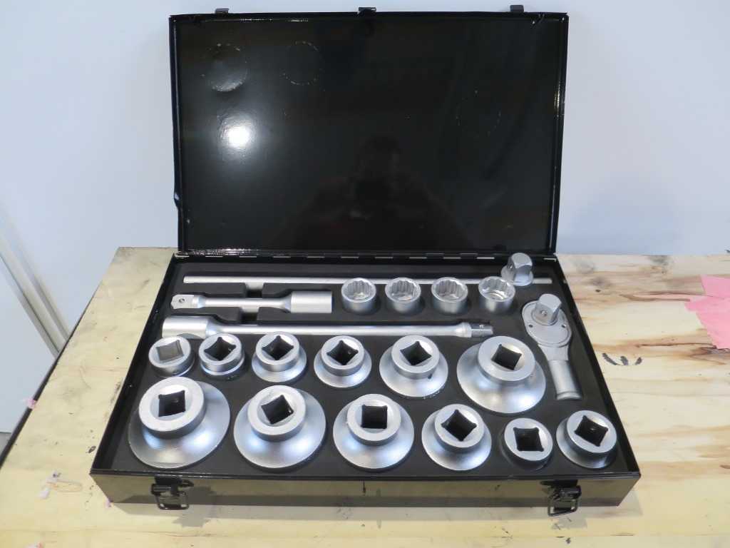 Nut sizes in 1\": 30 - 31 - 32 - 34 - 36 - 38 - 41 - 46 - 48 - 50 - 55 - 60 - 65 - 70 - 75 - 80mm. 1 x Ratchet Head. 1 x extension rod 400 mm. 1 x extension rod 200 mm. 1 x T connector 500 mm. Condition: never used / new (5) Auction-ID: A1-45681-846