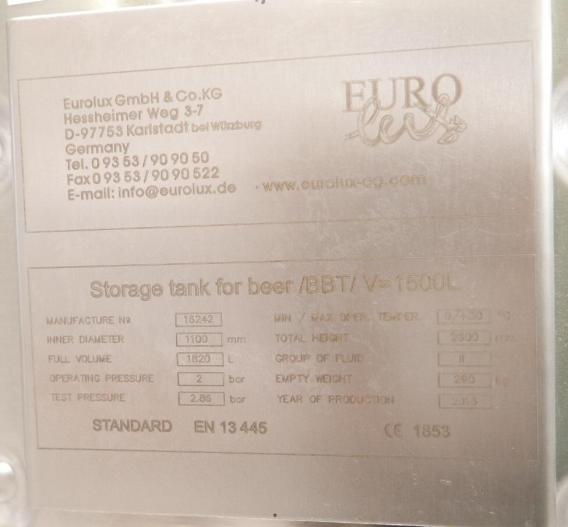 Tanque de cerveza Eurolux / tanques de almacenamiento / tanque de presión 400 litros con chaqueta de enfriamiento redondo de pie de V2A, Presión de funcionamiento: +2.0 bar Nuevo Placa de almohada en el interior Ab. Presión de funcionamiento: +3.0 bar +2.0 bar Presión de prueba: +5.1 bar +3.4 bar Ab. Vacío de funcionamiento: -0,15 bar -0,15 bar Temperatura de funcionamiento: +80/-10C +130/-10C Material: V2A - AISI 304, 1.4301 Superficie: manchada, pasivada y neutralizada Planta superior: - corona de apilamiento estable - Tapa de agujero alrededor de 400 mm con 2 x mango - Boquilla de soldadura DN 50 con tapa ciega DN 50 - 1 x válvula de sobrepresión - 1 x válvula de ventilación de CO2 - 6 x tornillos de cabeza estrella Cilindro inferior: - con chaqueta de enfriamiento ...