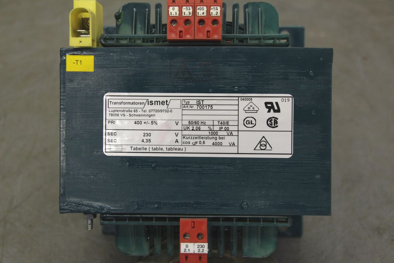 transformer -Type: IS -Item No.: 700175 -Primary: 400 V -Secondary: 230 V 4.35 A -Dimensions: 150/155/H130 mm -Weight: 12.6 kg