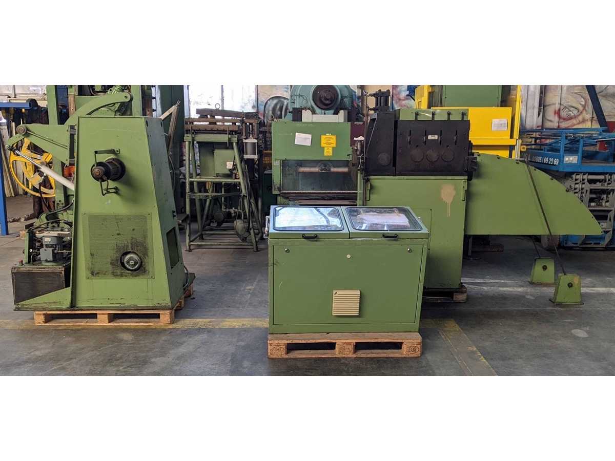Alimentador de rodillos ALBA, tipo UVHY 400, fabricado en 1989 Panel de control ALBA con gabinete de control Plancha Heilbronn, tipo RMG 7/500/80 (con 9 rodillos) Carrete Heilbronn, tipo HAEM2000/500, ancho de lámina hasta 400 mm, 3-4 toneladas incluyendo unidad de potencia hidráulica Auction-ID: A7-45388-1