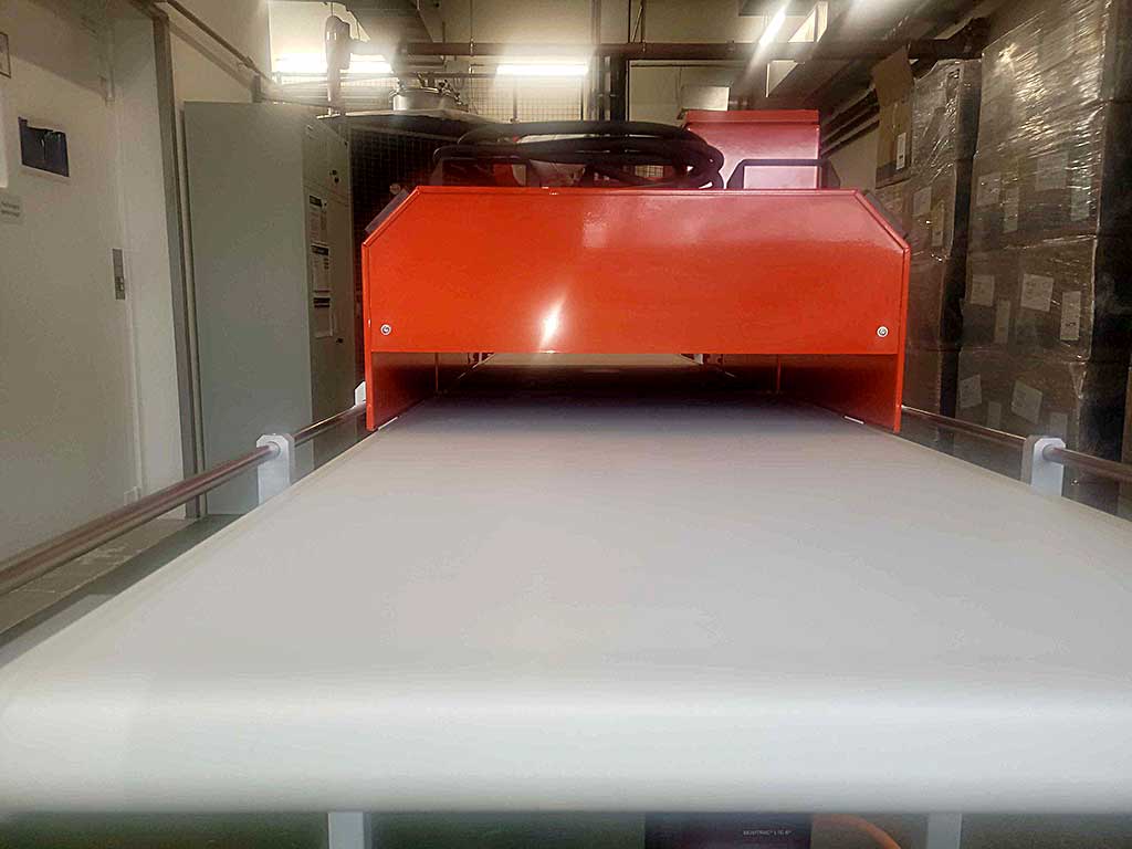 Offered is a continuous dryer/drying system: Drying units: Alraun infrared and hot air tunnel, transport system: Alraun railing belt TB70x300 (model 2233), infrared drying (model IR70x60/250C/2109): IR radiant heat, digital temperature controller A-Senco TR-85, adjustable upper alarm value (uPal) up to 300°C, hot air drying (model WL70x60/150C/480m³/h/2208): convection heat/hot air, air capacity: 480m³/h, temperature range: controlled heat up to approx. 150°C, transport system: Alraun railing belt TB70x300 (model 2233): drive: SEW-EURODRIVE gear motor, control: MOVITRAC®-LT frequency inverter infinitely variable speed control, dimensions X/Y approx. 700mm/3000mm, inspection possible by appointment.