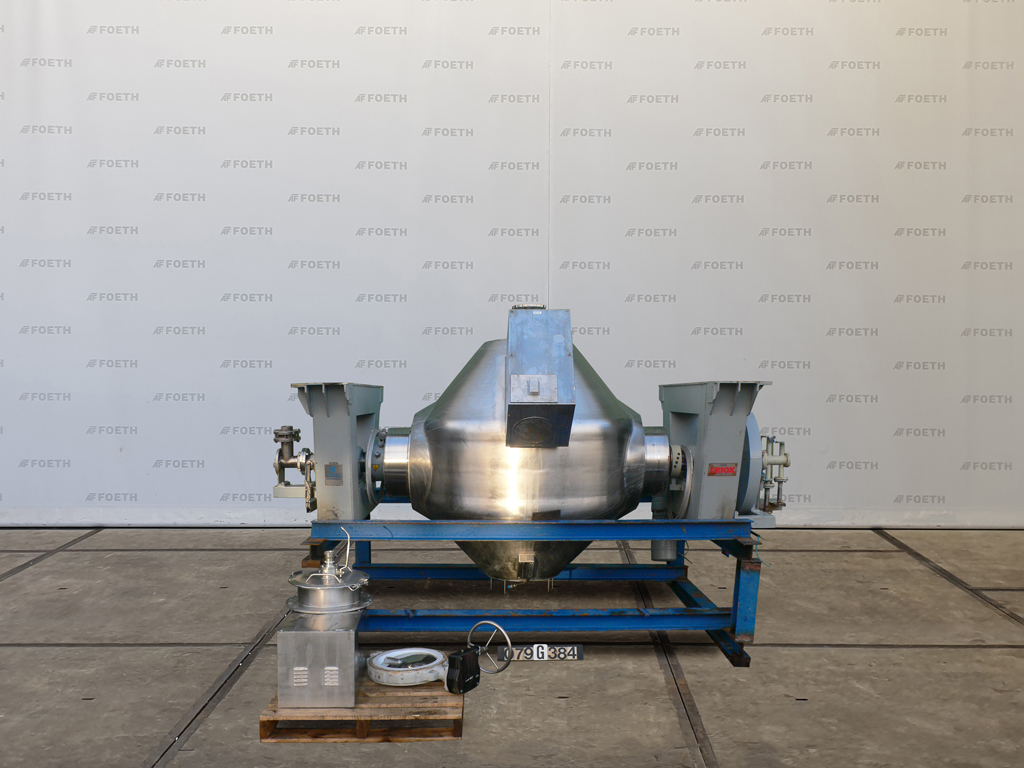 General SKU079G384 MakeItalvacuum Borgaro Torino TypeCriox RB-1500 No.3336 Year of construction1996 LocationBarneveld Pressure Working pressure0 Bar Vacuum possiblecheck Working pressure jacket1.5 Bar Main Features MaterialStainless steel Volume1500 Ltr. Specified Features - Tumbler dryer Double cone tumbler dryer(1x) Capacity1500 Ltr, Useful capacity 600 Ltr Inlet/man hole dia. 450mm Outletdia. 350mm With jacketcheck Max. temperature95 Degr. C. Motor1,5 KW, 230/400 Volt (Ex) MaterialStainless steel 1.4404 (316L) Information Floorspace4,0x2,3 M Total height2,4 M Weight4000 KG ATEX compatiblecheck Extra Specifications- Cone equipped with 2 flanges which can be used to install choppers DiscountTumbler dryersItalvacuumDiscountDryers > Tumbler dryersBrand > Italvacuum What you can expect from Foeth: -- Machine is in working condition -- At a reduced price compare ...
