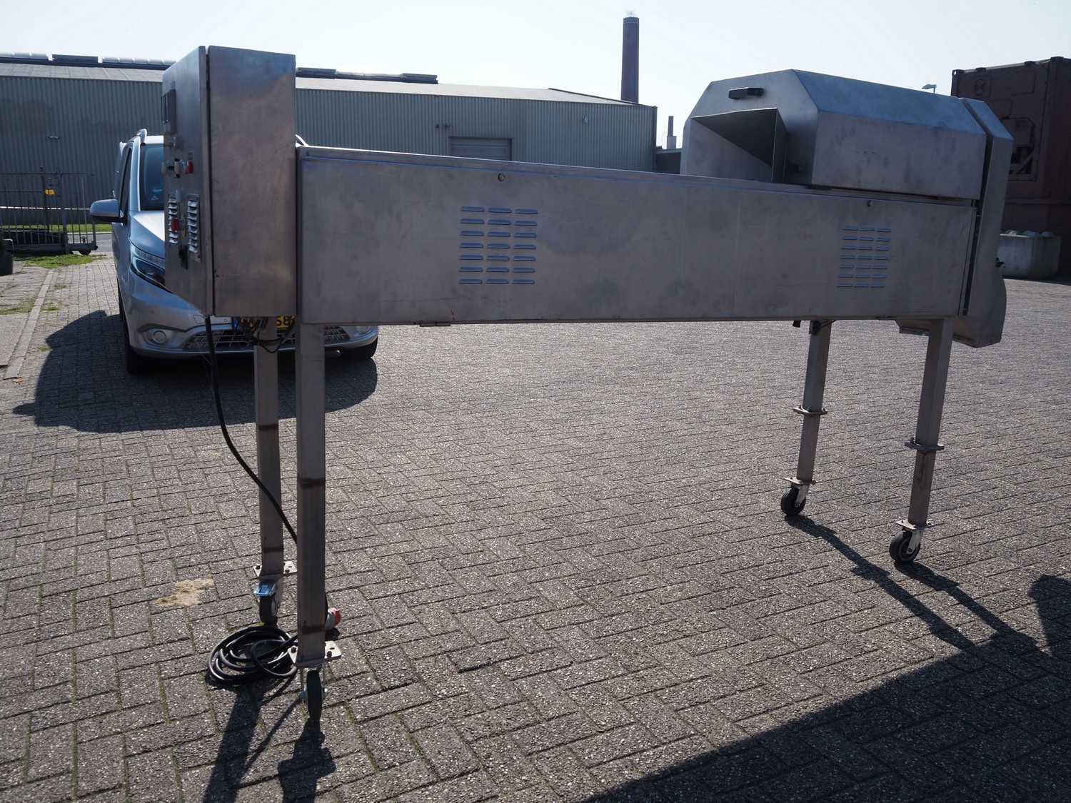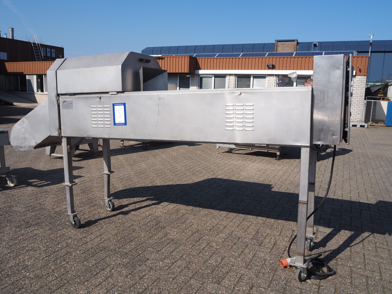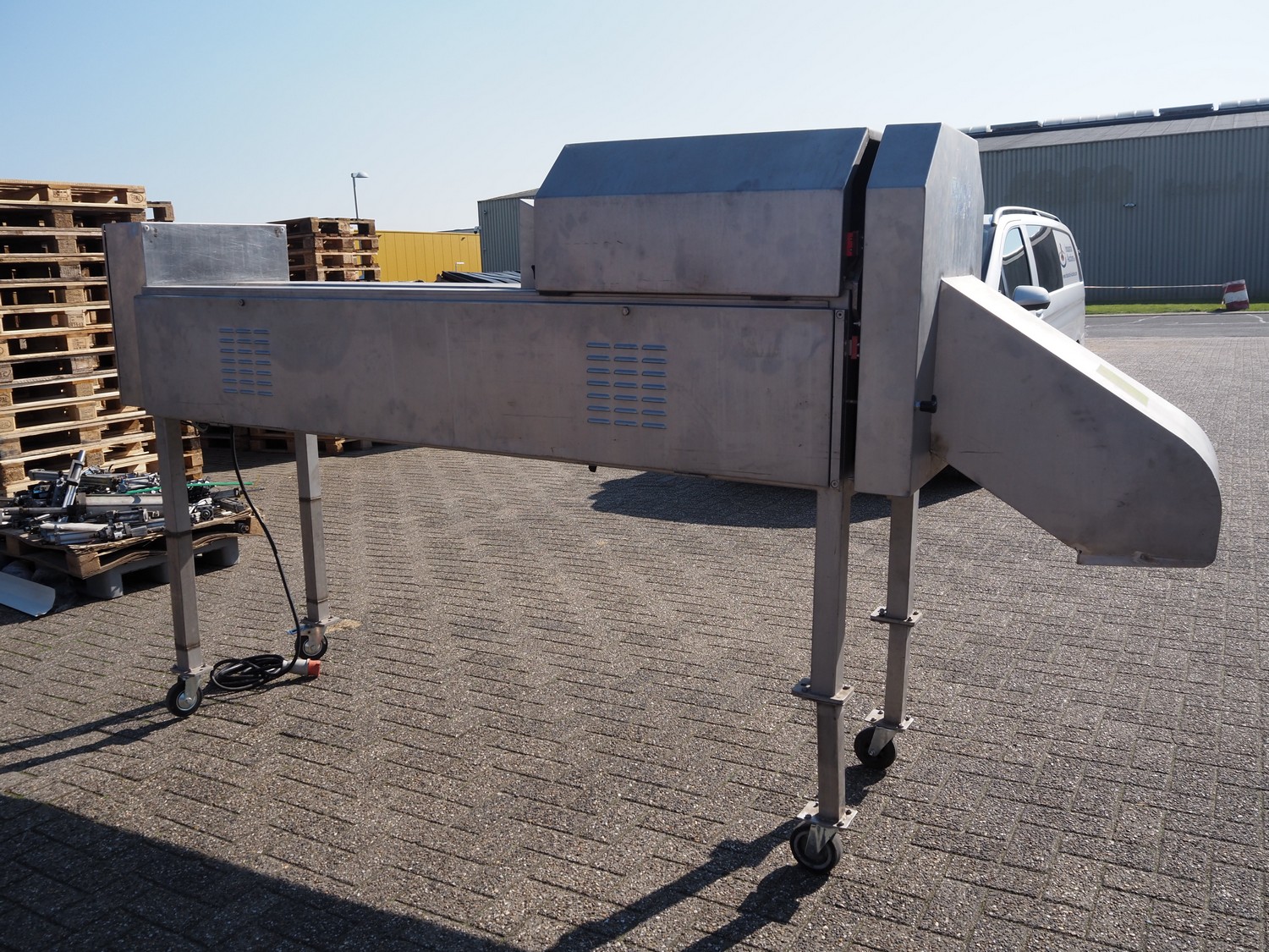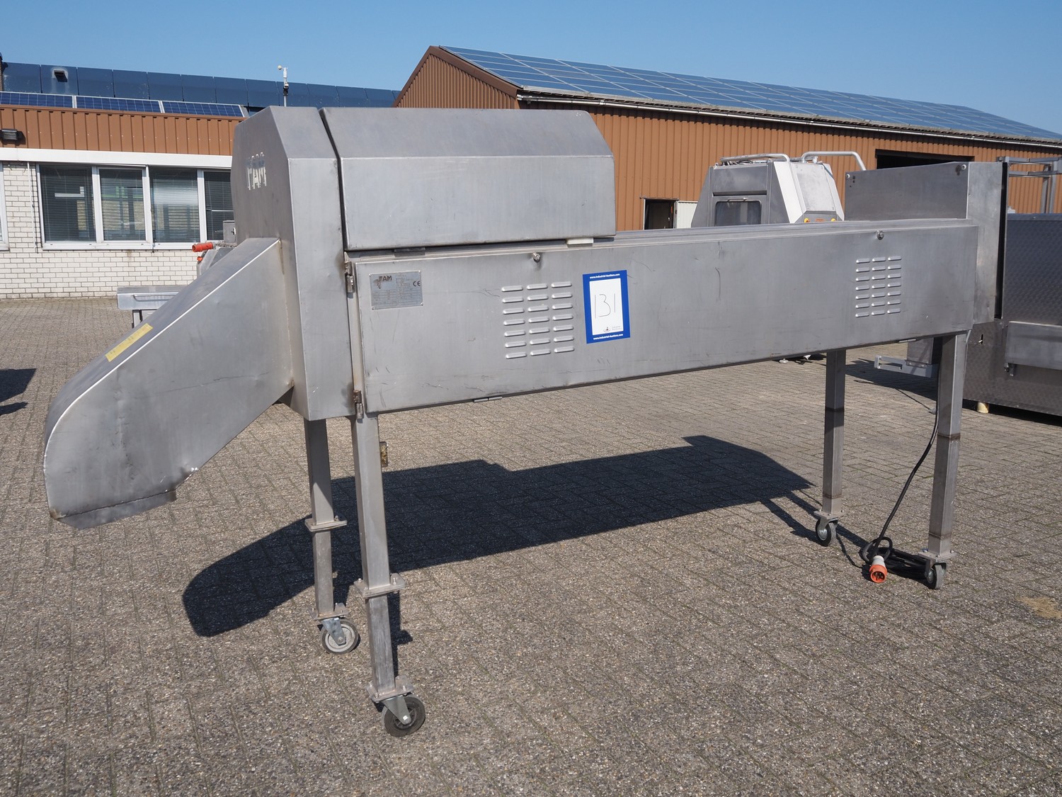 Trancheur mobile FAM, type : TS-1D, numéro de série : 5836, année de construction : 2003, 400 V, 3 Ph, 50 Hz, 3,5 kW, poids : 350 kg, courroie en plastique, largeur de bande : 85 mm, dégagement : 100 mm x 150 mm, dimensions totales : 3300 mm x 750 mm x 1750 mm.