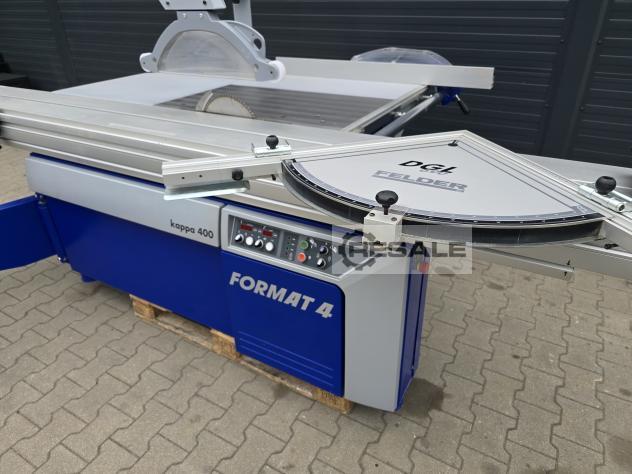 带托架滑台锯 Felder format4 划痕器 120mm,孔径 20mm,电动可调, 婴儿车长度 320 厘米 倾斜 0-45 电动可调,带读数 带读数的电动可调锯 右侧的 Culaga 可手动调节至 870 毫米 DGL Felder 角夹具 7.3KW 主电机 3 种切割速度 最大圆盘 400 毫米 生产年份 2022, 状况非常