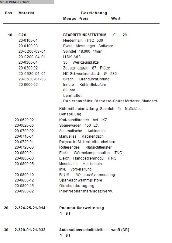 x-travel: 1135 mmy-travel: 1050 mmz-travel: 710 mm0: dia 1240 x 690 mmcontrol: Heidenhain TNC 640 : : 15000 min/-1: 35 kWtool taper: SK 40 work table:: table surface area: 1050 x 860 mmmax. table load: 2000 kg: : 30 pos.tool taper: SK 40 change-time chip to chip: 6 secfeeds:: : 40 m/minfeed speeds: 40000 mm/mintotal power requirement: - kWweight of the machine ca.: 18 tdimensions of the machine ca.: 5,1 x 3,99 x 3,4 m5-Axis Machine equipped with:- CNC Control Heidenhain TNC 640- universal Milling Head (B-Axis +30/-130°)- NC- rotary Table dia 800mm (C-Axis)- BMF coolant and filtration system. - electr. HandwheelThe data for this ad was created with ModulMWS - the software solution of LogoTech oHG.