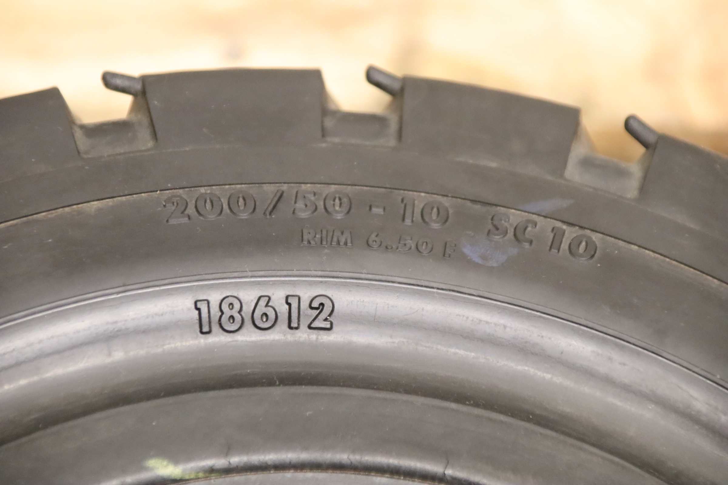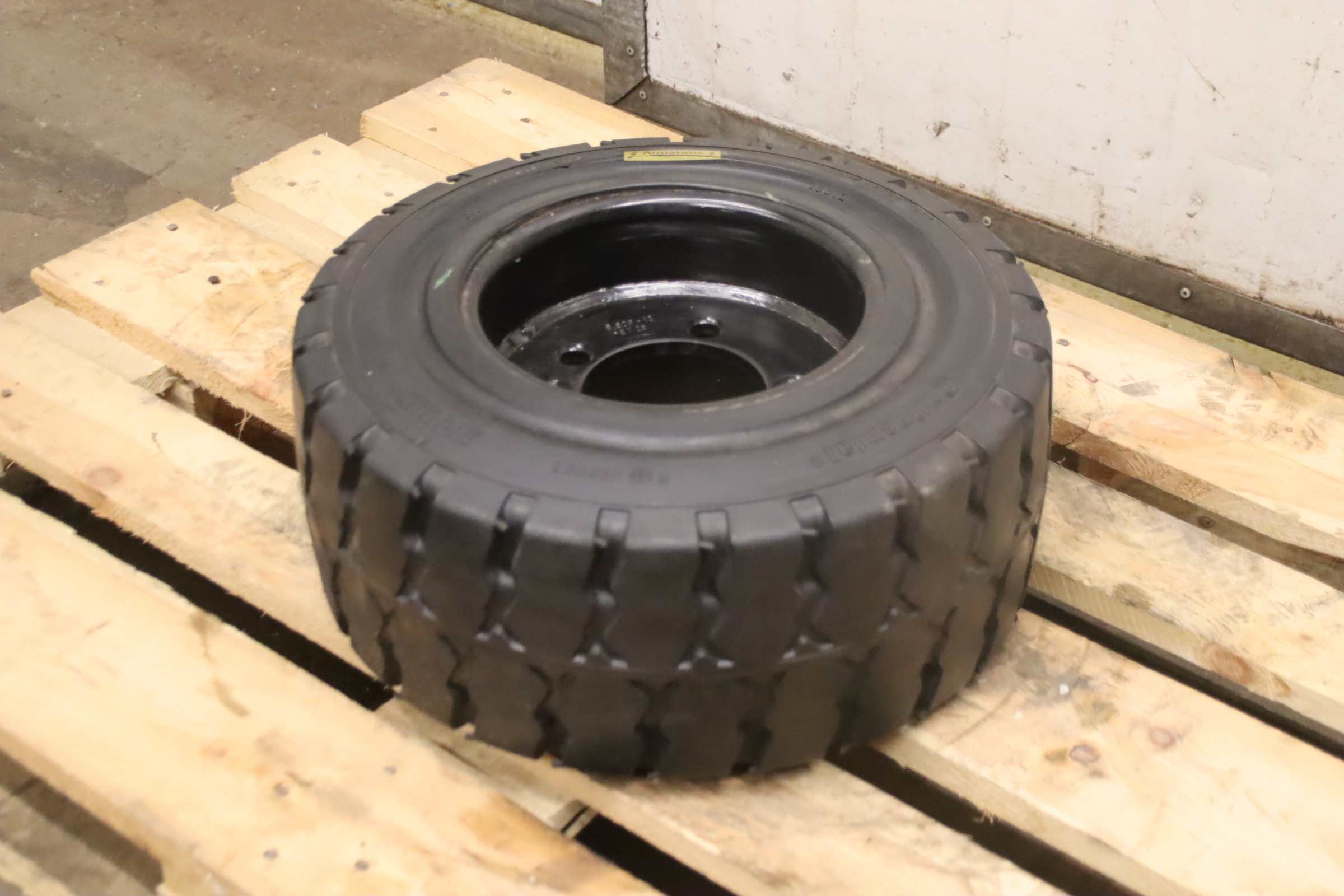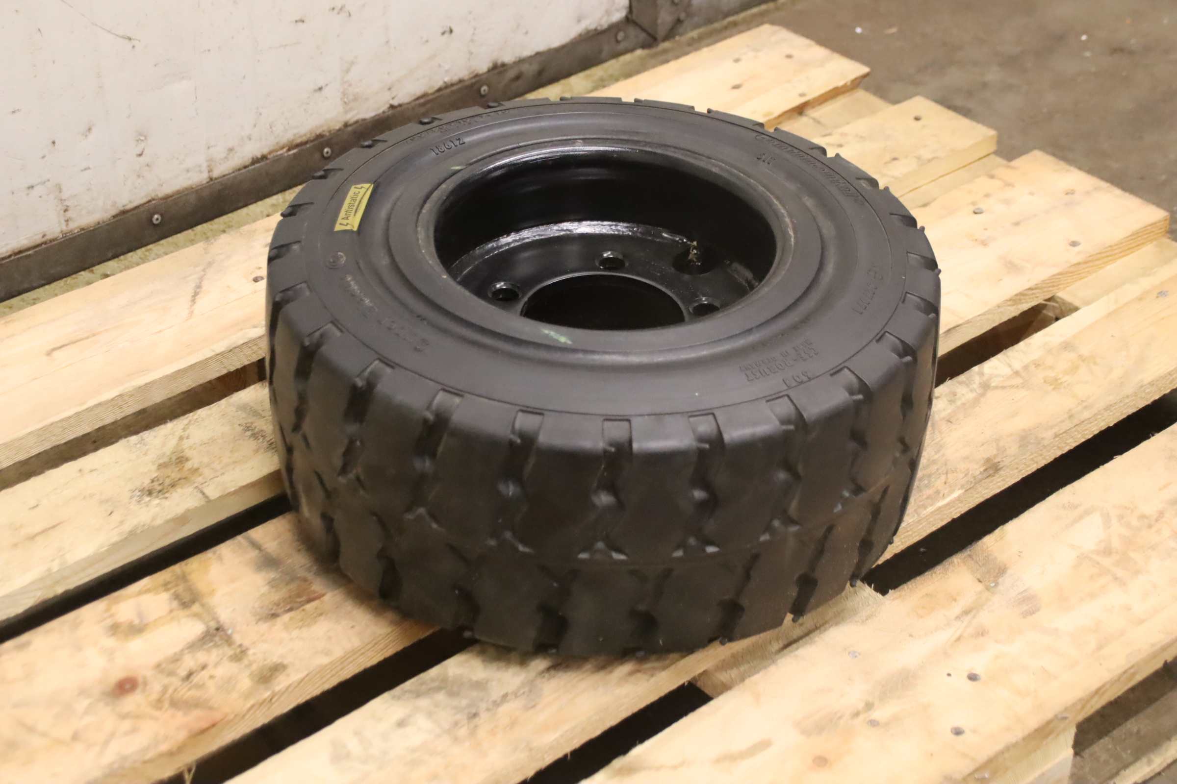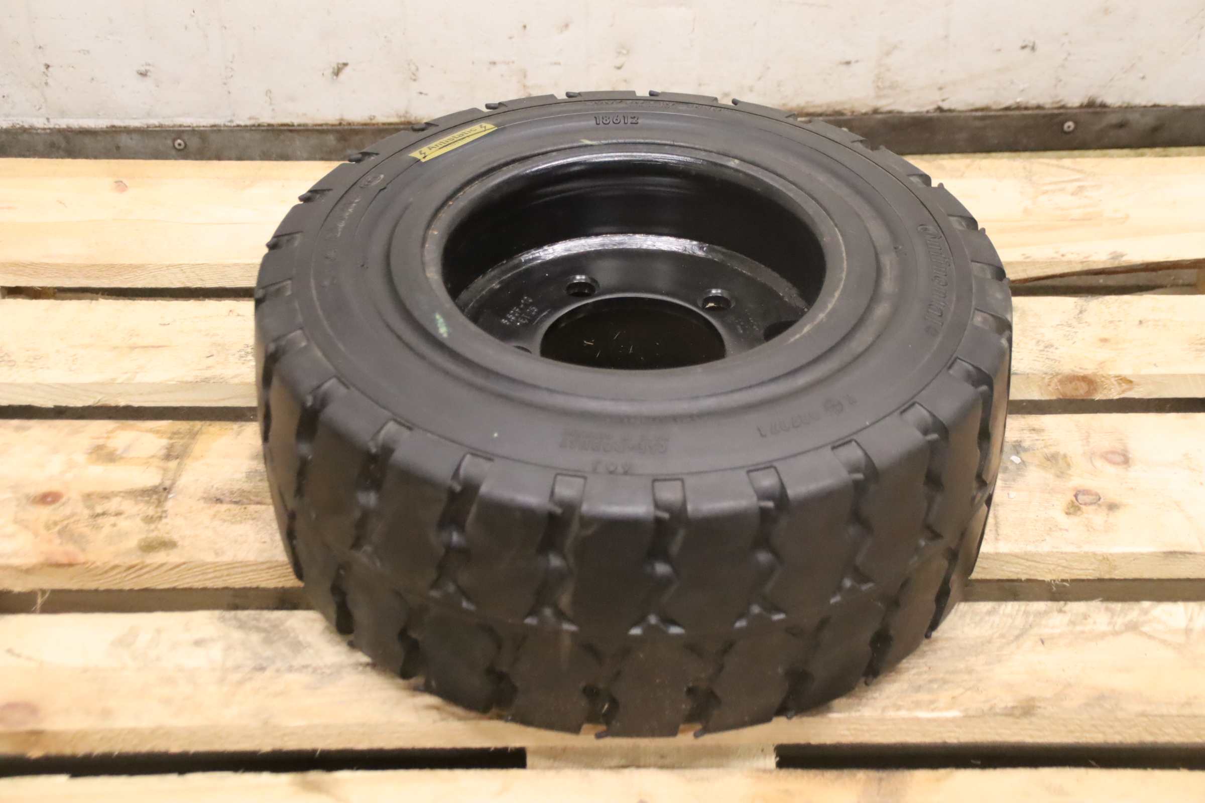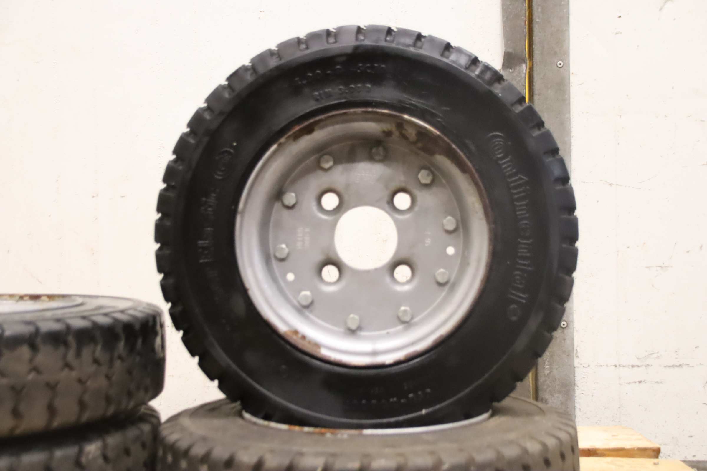 Tires, solid rubber tires, forklift tires -Manufacturer: Continental, solid rubber tires CSE-Robust Super Elastic SC 10, 3 pieces -Tire size: 250/50-10 SC 10 RIM 6.50F -Rim: Mefro 41042 106 6.50F-10 ET 25 -Bolt circle: Ø 150 x 19 mm -Hub bore: Ø 110 mm -Delivery/Price: complete -Dimensions: Ø 450 x 210 mm -Weight: 35 kg/pc.