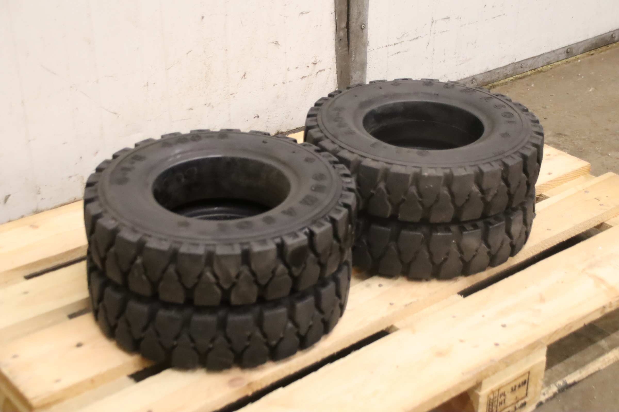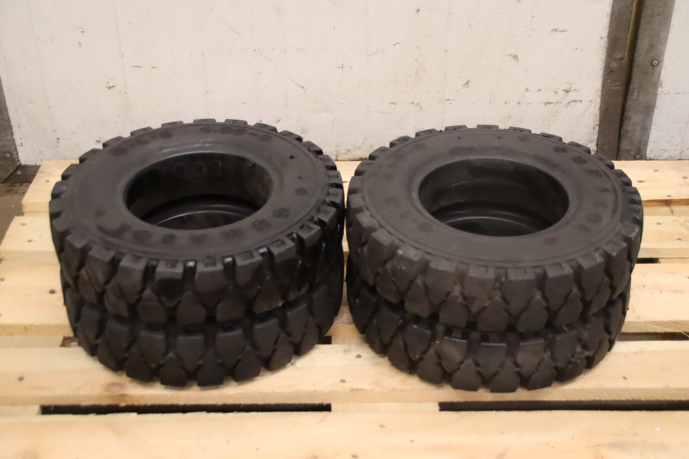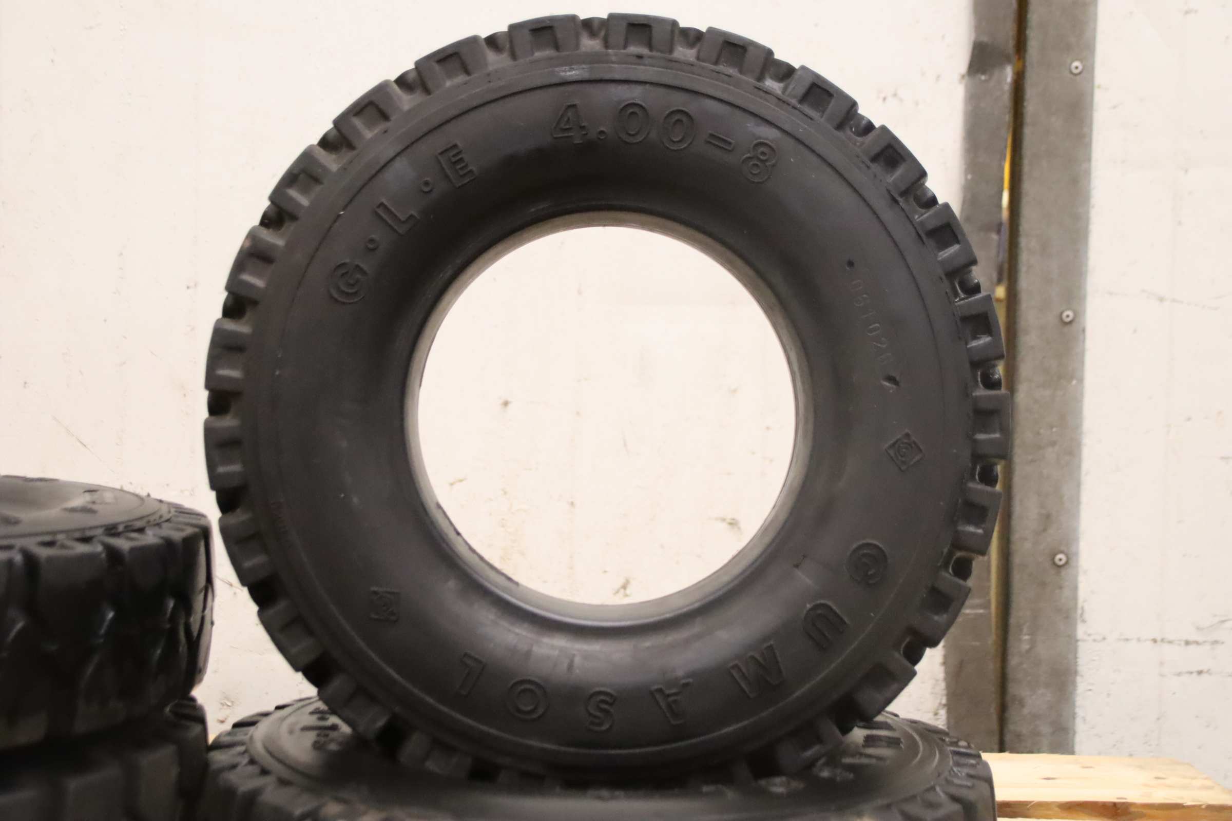 Tires, solid rubber tires, forklift tires -Manufacturer: Gumasol, solid rubber tires type GLE -Tire size: 4.00-8 -Quantity: 4 pieces available -Price: per piece -Dimensions: Ø 410 x 105 mm -Weight: 10 kg/pc.