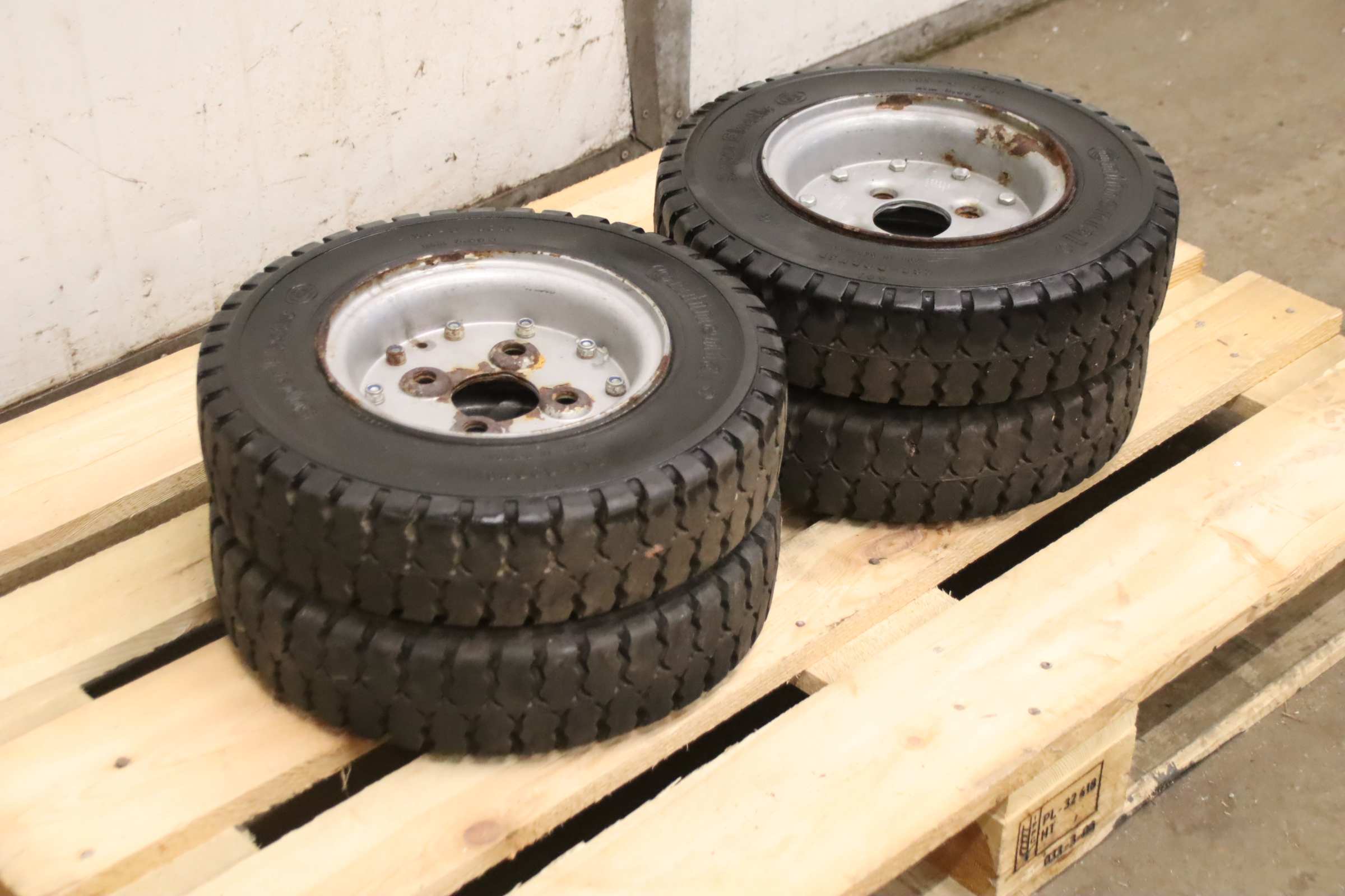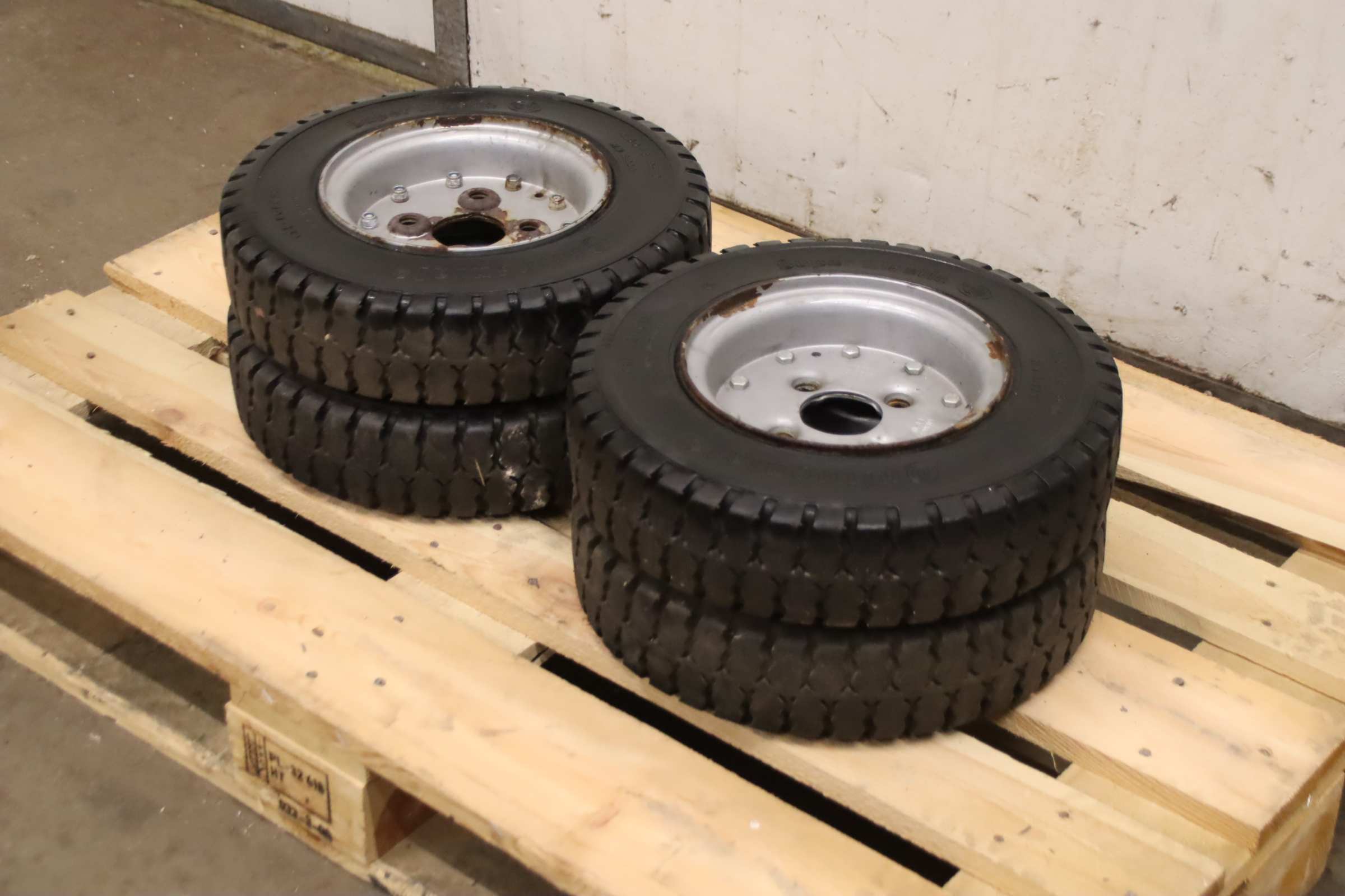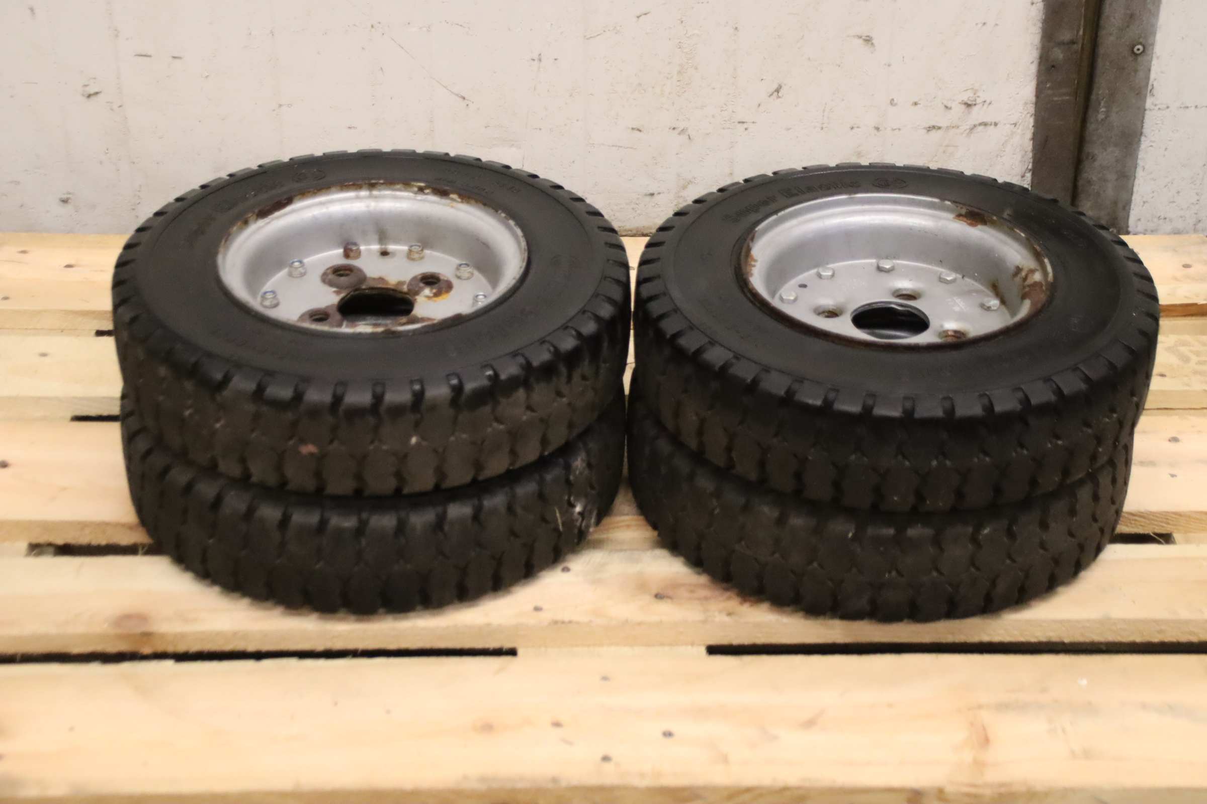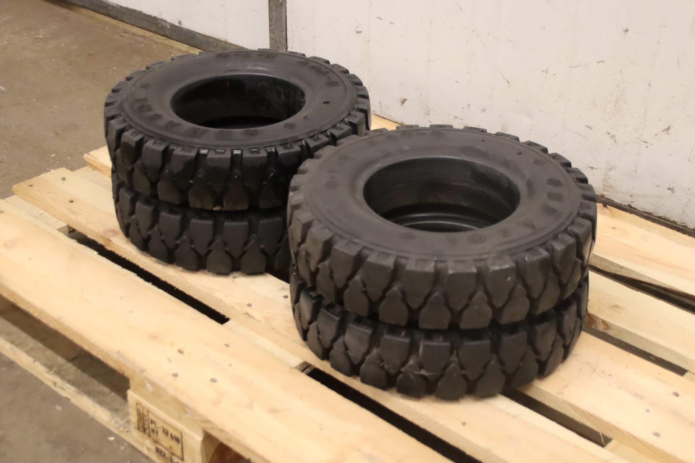 Tires, solid rubber tires, forklift tires -Manufacturer: Gumasol, solid rubber tires type GLE -Tire size: 4.00-8 -Quantity: 4 pieces available -Price: per piece -Dimensions: Ø 410 x 105 mm -Weight: 10 kg/pc.