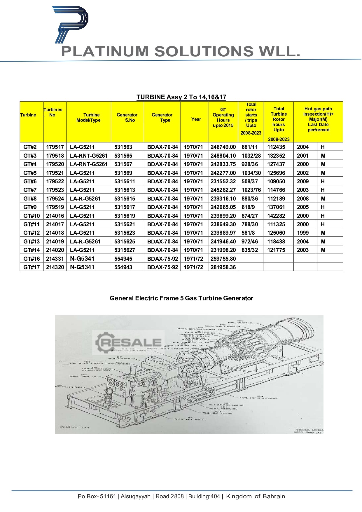 General Description – Frame 5 Gas Turbines (15 Units for Sale) The offering includes fifteen (15) Frame 5 industrial gas turbines manufactured by General Electric, known for reliable performance in power generation and mechanical drive applications. The GE Frame 5 Gas Turbine is a heavy-duty, single-shaft unit designed for continuous operation in demanding environments, with a typical output of approximately 19 MW per unit.