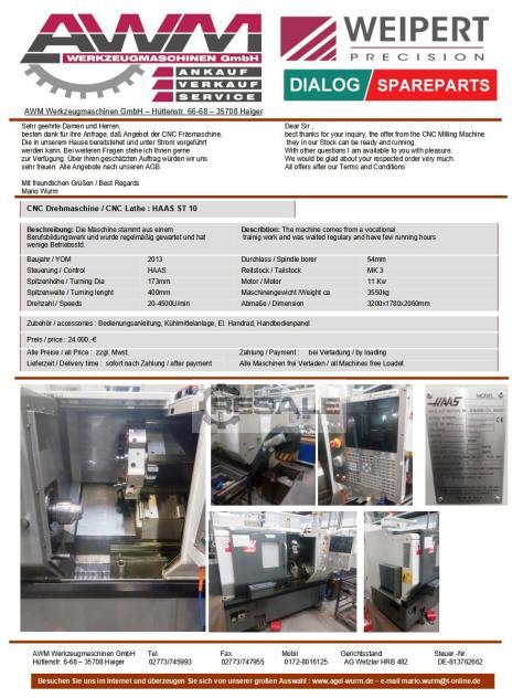 Dettagli della macchina Codice 1105-04050 Tipo di macchina: Tornio CNC - Macchina a letto inclinato Produzione di HAAS Tipo SL 15 Anno di costruzione 2019 Condizione Tipo di controllo: CNC Controllo Haas Luogo di stoccaggio HAGUENAU Paese di origine Tempi di consegna immediatamente Base di carico dalla posizione Prezzo Dettagli tecnici Diametro di tornitura 356 mm Lunghezza di tornitura 406 mm Controllo Haas Diametro mandrino 210 mm Passaggio 51 mm Diametro circonferenziale 480 mm Velocità 4000 giri/min Potenza 407 Nm Potenza 15 KW Cambio utensile 10 VDI Stadi di ingranaggi 0 Potenza totale richiesta 25 kW Peso della macchina circa 5 t Requisiti di spazio circa 3,3 X 2 X 1,9 H m Informazione CNC HASS DIAMETRO RIVESTIMENTO 210 MM SPAENEFOEDERER Contropunta