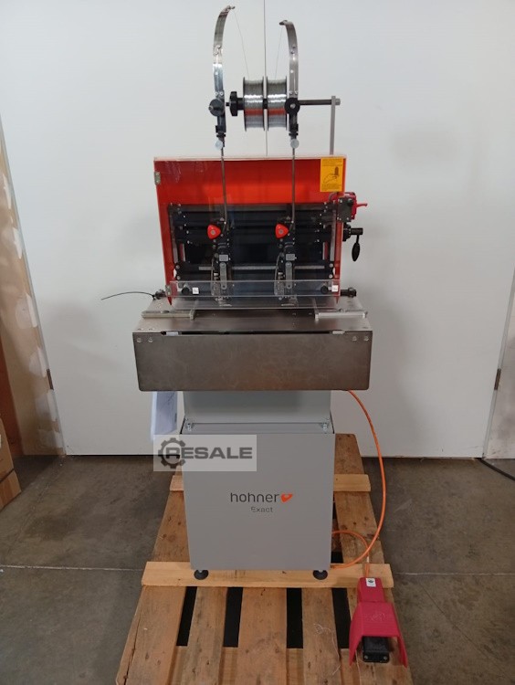 Description Höhner Exact Plus semi-automatic wire stitching machine with 2 or 4 Hohner Universal HK 52-8 stapling heads from 1996 The semi-automatic stapling machine with manual feeding station enables standard stapling and eyelet stitching or mixed applications. The difference between this machine and conventional wire stapling machines is the possibility of collecting and stapling even unusual formats or paper weights. Subsequent expansion to up to 6 stations possible Highest efficiency with up to 4000 cycles per hour. Gentle transport of the brochures via double carriers,
