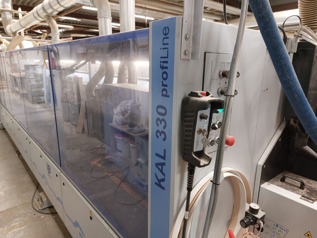 Used single-sided edge banding machine Brand: Homag Type: Profi KAL 330/ 9/A6/L Year of manufacture: 2011 Feed speed Infinitely adjustable 18-25 m/min Release agent spray unit top/bottom - To reduce surface contamination. Jointing unit KAL300/S2 - 2 motors, each 3 kW, Hz 9000 1/min - Motor shaft Ø 30x68 mm, KN - Electropneumatic control of both motors for joint milling. - Automatic adjustment of the joint milling cutter to the center of the workpiece. Melting unit with granulate container - Granulate container 12L - Level control of the melting quantity Lasertec activation unit standard - The gluing unit is designed so that it can be used with either EVA/PU adhesive or LaserTec. - Manual conversion from LaserTec to PU/EVA Magazine 1 roll - For solid edges, strip goods, and roll goods - Automatic strip separation via vacuum suction cup - 1 edge f ...