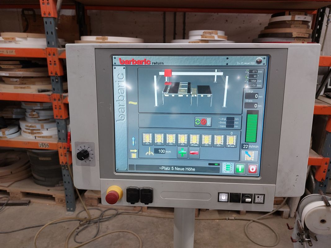 Inv. Num. : 8966 Tipo: Optimat KAL 210/A3/S Produttore: HOMAG Creato: 2008 Parametri: Sistema di Controllo: Power Control PC 22 Altezza di rimontaggio: 950 mm Spessore del bordo: 0,3-3 mm Spessore della parte: 12-40mm Velocità di avanzamento: 18-25 m/min Minimo. Larghezza del materiale: 60 mm Dimensioni della macchina: 8300 × 1300 × 1800 mm