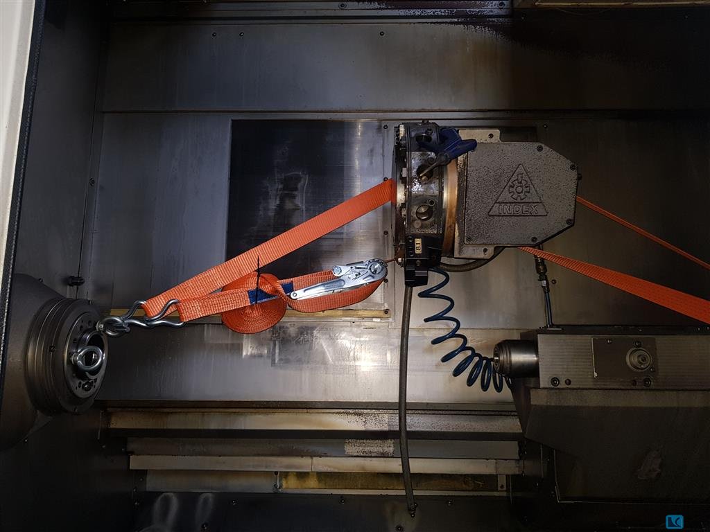 swing diameter: max. 450 mm chucking diameter: 400 mm control: Siemens 840D (Index) Main spindle:: Max. rpm: 4.200 min/-1 power capacity - main spindel: ( 35,5 / 56 ) kW max. Torque: ( 340 / 550 ) Nm C-Axis: 0,001 ° turret:: number of toolpositions: 2x 12 pos driven statition: 2x 12 pos worktool system: VDI 30 max. spindle speed driven tools: 6.000 U/min. power capacity - driven tools: 9,5 kW max. Torque: 40%: 19 Nm Y - Axis: +/- 90 mm B-Axis: +270° / -90 ° axis stroke:: x-axis: 730 mm z-axis: 340 mm y-axis: +/- 90 mm b-axis: +270° / -90 ° feeds:: rapid traverse: X: 40 / Z: 30 m/min pallet changer:: numbers of pallets: 24 pos. size of pallet: 410 x 300 mm max. workpiecediameter: 300 mm max. workpiece weight: incl. Pallet: 25 kg Chain width: 75 mm band speed: 7,5 m/min total power requirement: 56 kW weight of the machine ca.: 9,0 t dimensions of the machine ca.: 8,5 x 6,0 x 2,7 ...