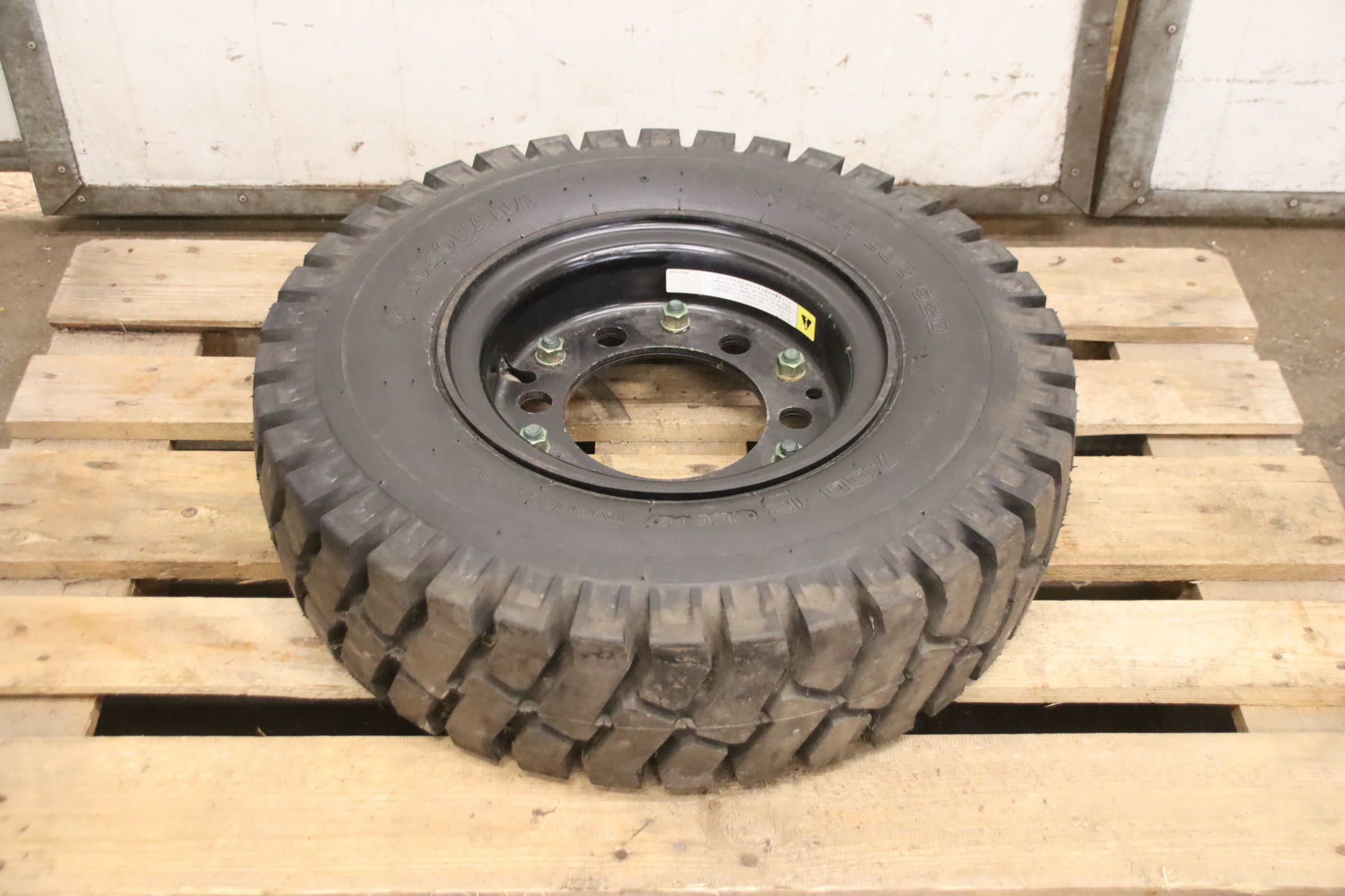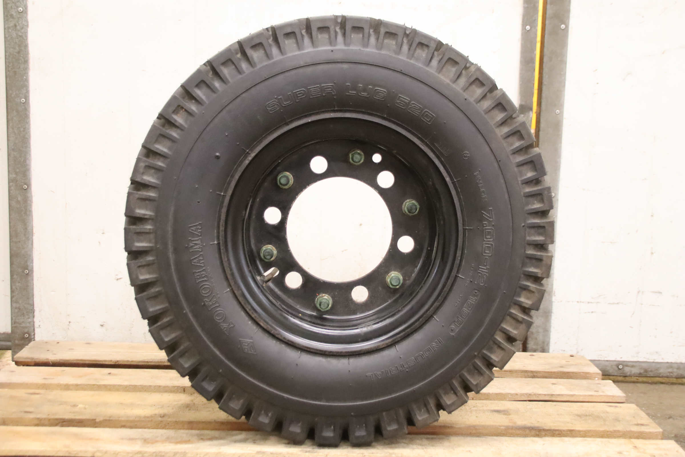 Tires with rim, trailer tires, heavy-duty tires, heavy-duty wheels, forklift tires -Manufacturer: Yokohama, Complete wheel Super Lug 520 2 pieces tire with tube and rim -Tire size: 7.00-12 12PR14 -Bolt circle: Ø 220 x 26 mm -Hub bore: Ø 170 mm Quantity: 1 piece available -Dimensions: Ø 680 x 185 mm -Weight: 33 kg