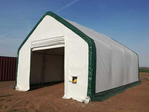 Dotato di tenda di deposito / rifugio di deposito; sistema a doppio traliccio e tubo; galvanizzato; entrambe le estremità una porta; colore bianco; incluso il manuale di assemblaggio; Non utilizzato in scatola metallica (dimensioni di trasporto 315x110x98 cm) Auction-ID: A1-40103-13