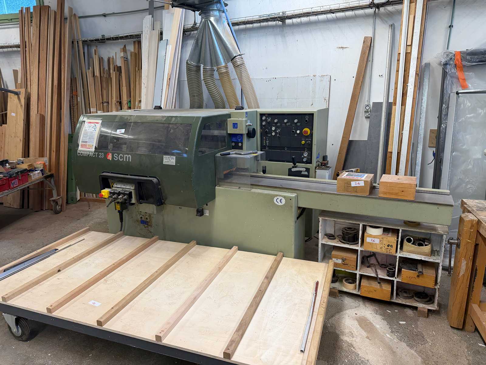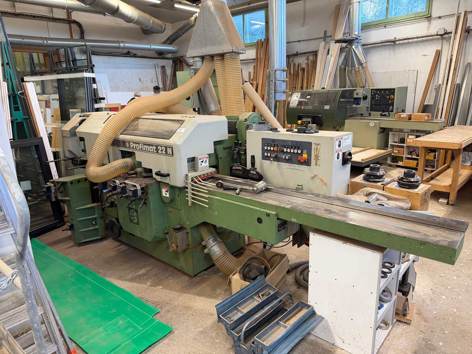 automatische 4-Wellen Hobelautomat SCM COMPACT 23 gebraucht maschine 4 spindeln Betriebszustand: exzellent CE-Zeichen: Ja volt. 380/50 mit werkzeug: Ja . n.04 Werkzeuge mit austauschbar Einwegmessern Kompositionsmaschine : 1° Spindel : Hobel . Motorleistung PS 5,5 (Kw 4) 2° Spindel und 3° Spindel : rechts vertikal und links vertical . Motorleistung PS 7,5 (Kw 5,5) 4° Spindel : Dickenhobel . Motorleistung PS 5,5 (Kw 4) technische details : 2-Gang-Vorschub. Motorleistung PS 1,3 / 1,7 (Kw 1 / 1,3) wellendrehzahl U/min 6000 vorschubgeschwindigkeit : 6 / 12 mt./min max. nutzbare Arbeitsbreite mm. 230 max. nutzbare Arbeitshöhe mm. 125 wellendurchmesser mm.40 einlasslänge mm. 2300 schmiersystem elektrische Höhenverstellung. motorleistung: 0,5 PS (0,37 kW) gewicht kg. 1600 bedienungsanleitung CE-zertifizierung