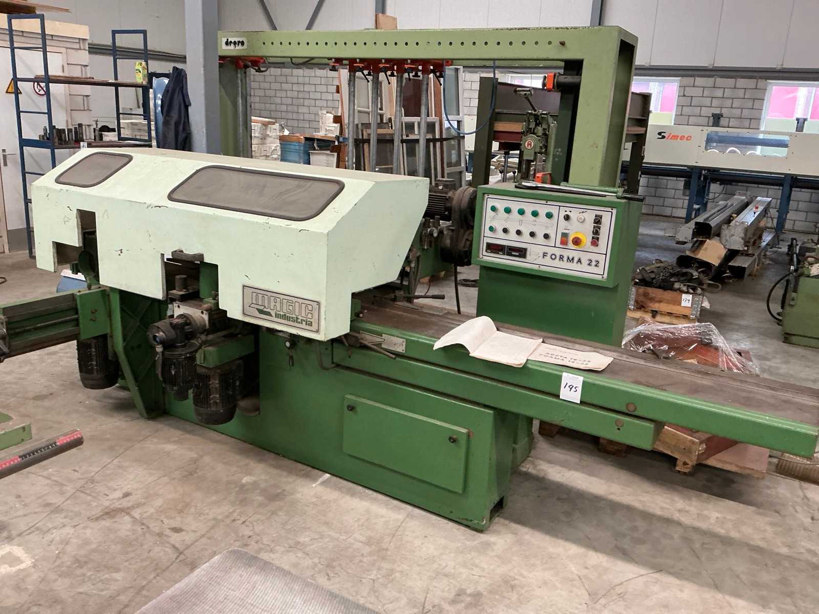 Macchina: 4 lati WEINIG PROFIMAT 22 N Anno: 1989 Larghezza massima di lavoro: 220 mm Altezza massima di lavoro: 120 mm Lunghezza dell'ingresso del tavolo: 1950 mm Velocità di avanzamento: 4 - 22 m/min Attrezzi: 4 portaferro affilabili Assi: Regolazione digitale QTS Alberi: 6 unità, Ø40 mm Motori: 4 kW degau, 2 router da 5,5 kW, piallatrice da 5,5 kW, motore inferiore da 4 kW, albero universale da 5,5 kW Equipaggiamento: lubrificazione centrale, motore di lubrificazione, involucro di sicurezza elettromagnetico Auction-ID: A1-45443-14